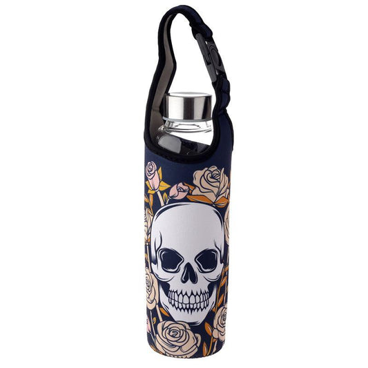 Reusable 500ml Glass Water Bottle with Protective Neoprene Sleeve - Skulls & Roses