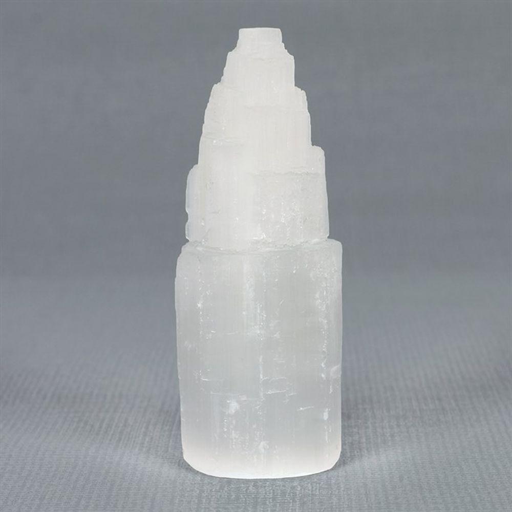 Selenite crystal in a mountain formation which shows the beauty of the natural structure of the crystal. Also known as 'liquid light' Selenite is often used by spiritual wellness profressionals as a tool to clear negative energy and purify emotions.