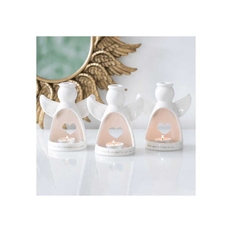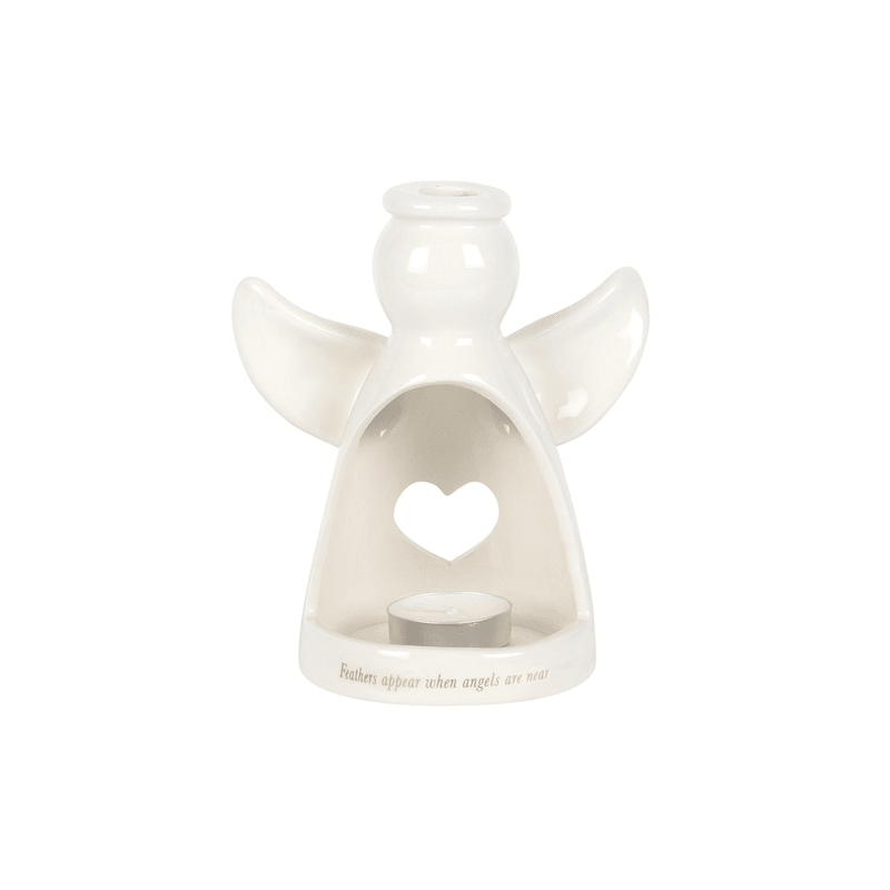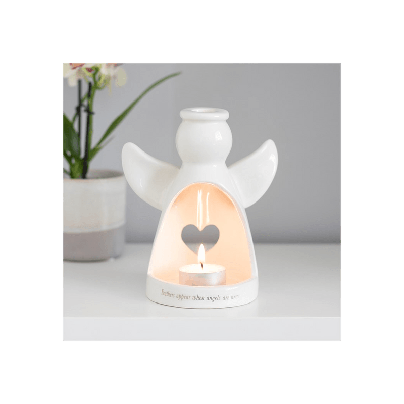 A white tealight holder shaped like a sweet angel with a heart-shaped cut out. Features gold 'Feathers appear when angels are near' text that is sure to bring comfort and reassurance to those in need of an extra dose of care.Product Dimensions: H15cm x W13cm x D9cm Packaged Dimensions: H15.5cm x W11.5cm x D10.5cm