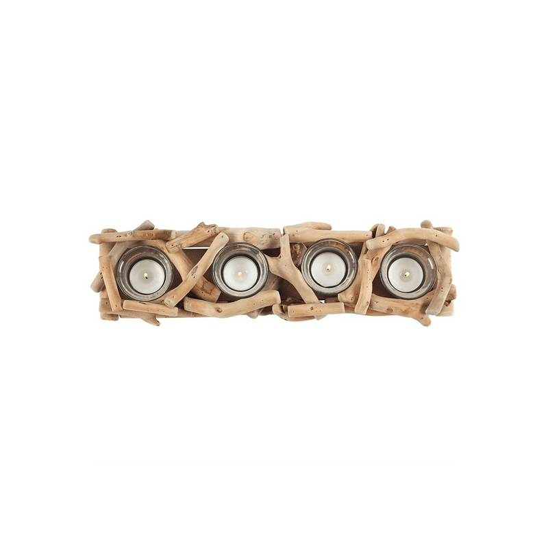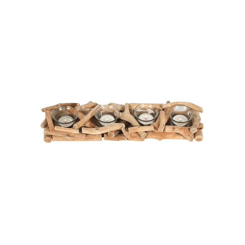 Place four of your favorite tealights in the center of this driftwood and glass candle holder to fill your home or office with the feeling of the seaside. Size and shape of driftwood holder may vary due to the natural differences in the material. Candles not included.Product Dimensions: H6cm x W40cm x D10cm Packaged Dimensions: H6cm x W40cm x D10cm