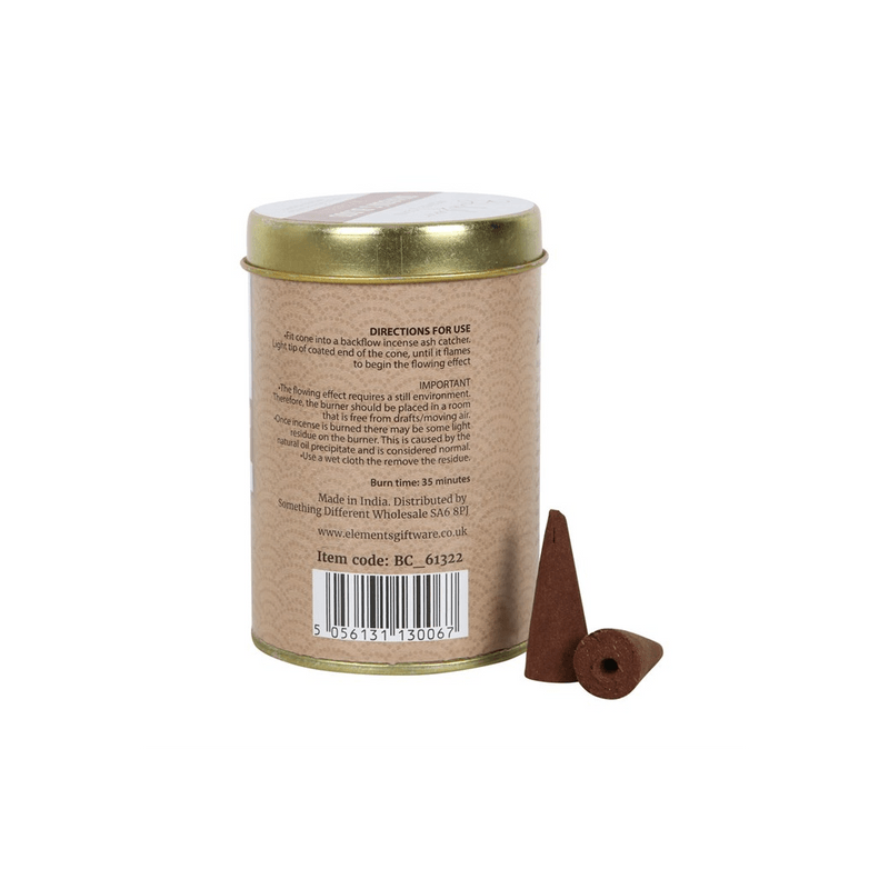 Handmade in India using traditional techniques, this cardboard tray includes 6 individual tins of 20 Dragon's Blood backflow incense cones by Elements Home Fragrance. Use in backflow incense burners to create impressive smoke flow displays while fragrancing the home. Approximately 40 minutes burn time per jumbo cone. Vegan. Read directions before use. Product Dimensions: H10.2cm x W7.1cm x D7.1cm Packaged Dimensions: H10.3cm x W21.5cm x D14.3cm