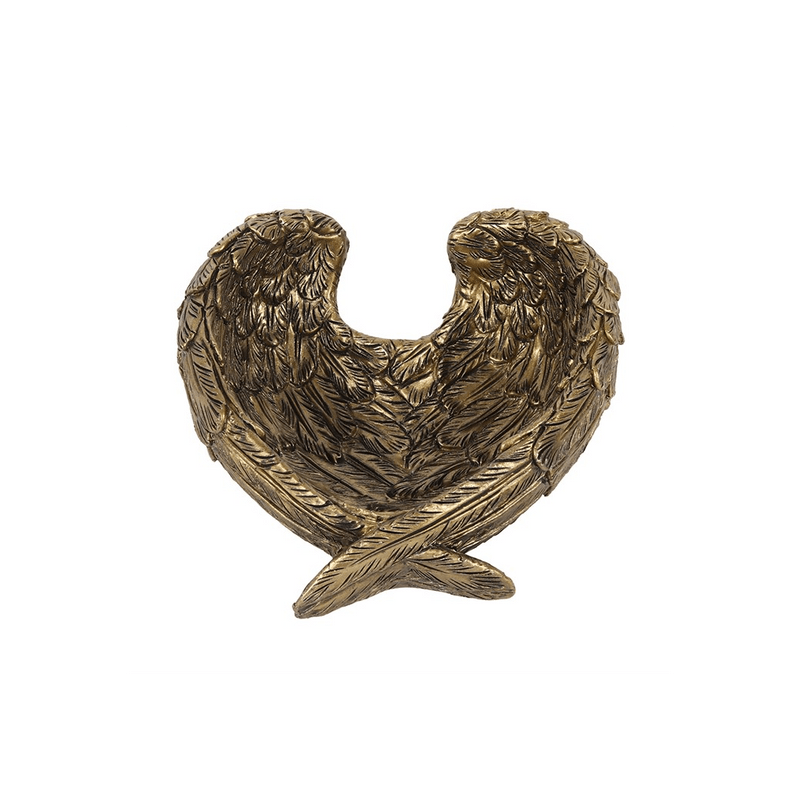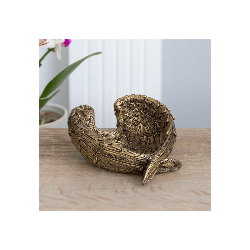 Store treasured trinkets in this angel wing dish with an antique gold effect finish. Product Dimensions: H5cm x W11cm x D11cm Packaged Dimensions: H13cm x W12.5cm x D6cm