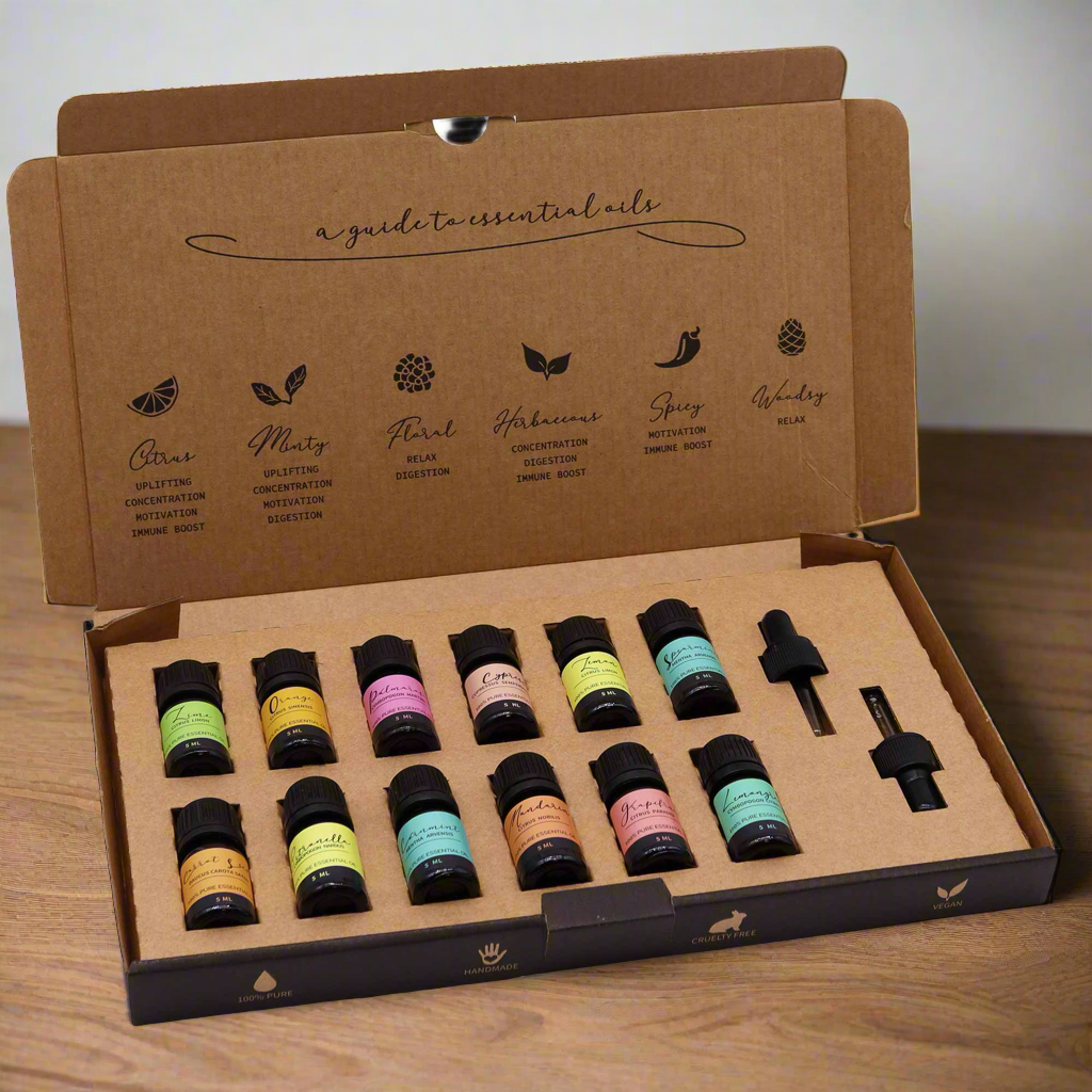 Our Aromatherapy Essential Oil Set offers a wide range of scents for the home and mind. This set includes 12 essential oils (5ml each) and 2 droppers. From floral and minty to woody, spicy, and herbal, our essential oil gift set combines various aromas to enhance your well-being.