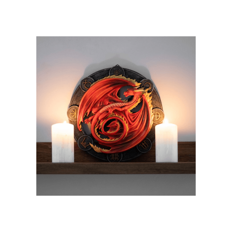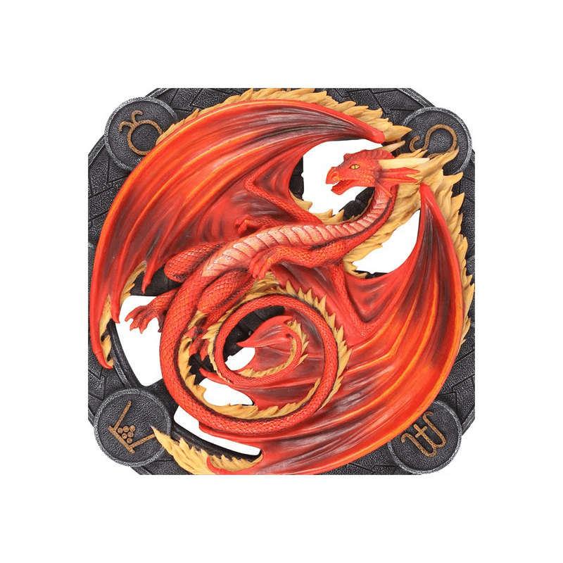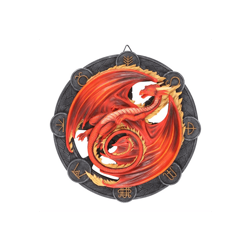 Introducing a stunning addition to your wall decor collection - a highly-detailed resin wall art plaque that boasts a mesmerizing 3D rendition of Anne Stokes' 'Mabon' dragon artwork. This captivating masterpiece showcases a circle of sabbat symbols, with the powerful symbol of Beltane gracing the top of the wheel, commemorating the Gaelic May Day festival. The swirling red dragon, engulfed in enchanting flames, truly steals the show and is sure to capture the attention of all who behold it. The art piece is part of Anne Stokes' celebrated 'Dragons of the Sabbats' series, which features a unique and enthralling representation of mythical creatures in relation to the eight Wiccan sabbats. Don't miss out on the opportunity to own a truly remarkable piece of art that will add a touch of mystical charm to your home or office. Product Dimensions: H27cm x W27cm x D4.5cm Packaged Dimensions: H31.5cm x W31.5cm x D8.5cm