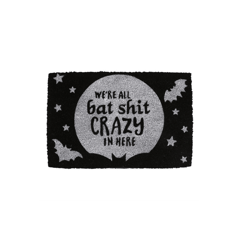 Warn guests of what's to come with this funny doormat featuring 'We're all bat shit crazy in here' text. Made from 60% Coir and 40% PVC. Due to the high concentration of dye used to obtain this colour do not place onto pale surfaces (especially leather) as this may result in dye transfer. Design may fade in extreme weather. Suggested for sheltered and indoor use only.