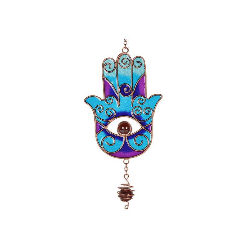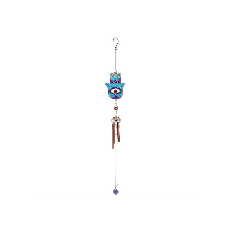 Stunning blue Hand of Hamsa windchime which would make a great addition to an outdoor zen den or meditation garden. In many cultures the Hand of Hamsa represents the Hand of God and is seen as a protective symbol. Product Dimensions: H73cm x W9cm x D4cm Packaged Dimensions: H14cm x W9.5cm x D5.5cm