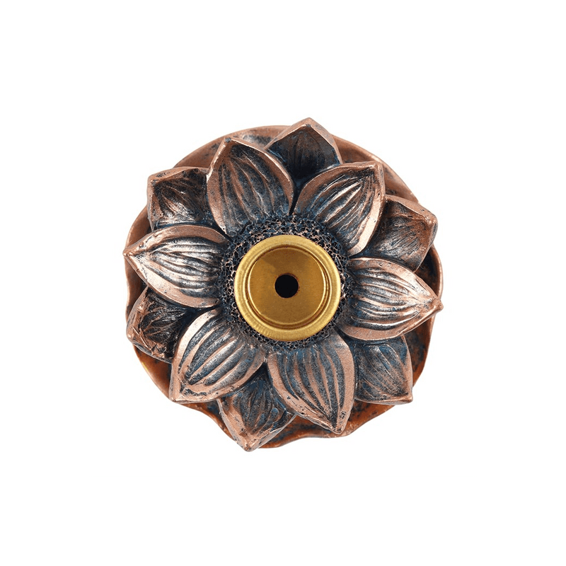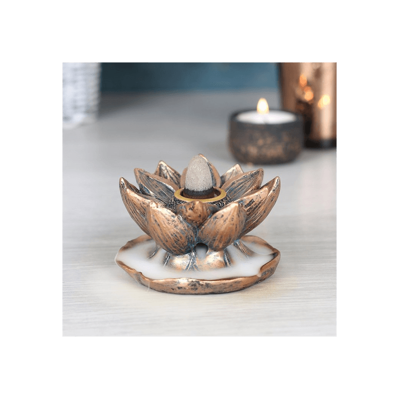 A beautiful backflow incense burner in a bronze lotus flower design. When the cone is lit the smoke from the cone cascades downwards in a mesmerising waterfall effect to pool at the bottom. Beautiful to watch. For best effects burn indoors in an area away from any sudden air movements. Please note that after burning it is normal for a light oily residue to appear on the oil burner, for this reason we recommend protecting any furniture it is placed upon suitably. The residue can be easily wiped off the burner with a damp cloth. Please exercise caution when burning incense. Only backflow incense cones should be used with this product ? standard incense cones will not create the desired effect. It is normal for cones to take up to 10 minutes after being lit to start creating the smoking/mist effect. Product Dimensions: H4.5cm x W7.5cm x D7.5cm Packaged Dimensions: H7cm x W9cm x D8.5cm