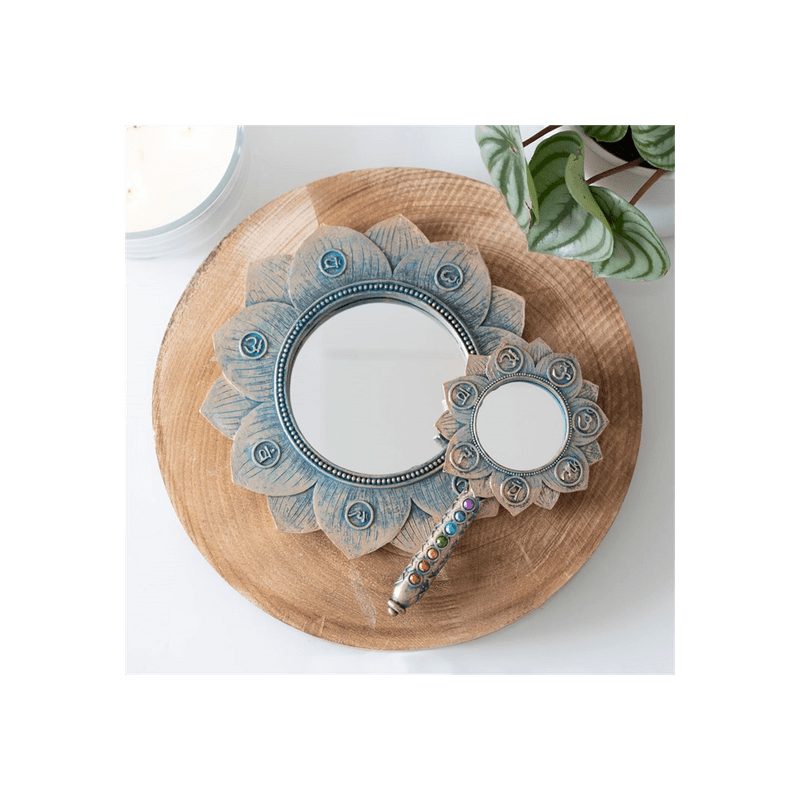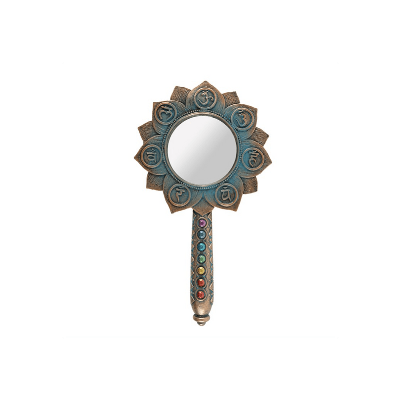 This lotus flower hand mirror is accented by symbols and gems representing the seven chakras and is finished with an antique bronze effect. Makes a great accessory for a dressing table or vanity. Mirror diameter (minus frame and handle) measures 5.5cm. Product Dimensions: H18.5cm x W10cm x D1cm Packaged Dimensions: H22cm x W13.5cm x D5cm