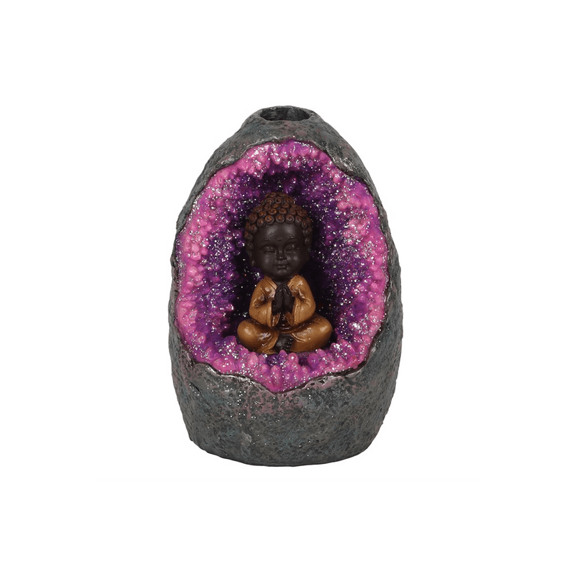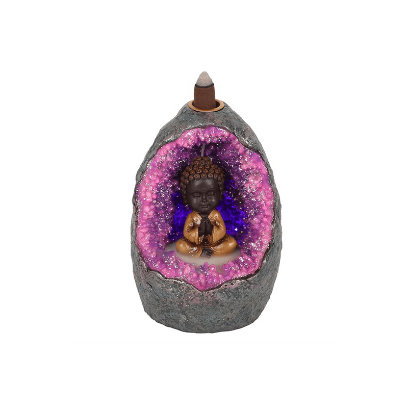 A meditating Buddha sits within a sparkling crystal cave on this eyecatching backflow incense cone burner. An LED cycles through a rainbow of light colours, perfectly showcasing the flowing smoke and Buddha figure. To use, simply place a backflow incense cone on top of the burner and watch as the smoke falls below. Bottom on/off switch. 2 AA batteries required. Not included with the product. Product Dimensions: H15cm x W10cm x D10.5cm Packaged Dimensions: H18cm x W14cm x D14.5cm