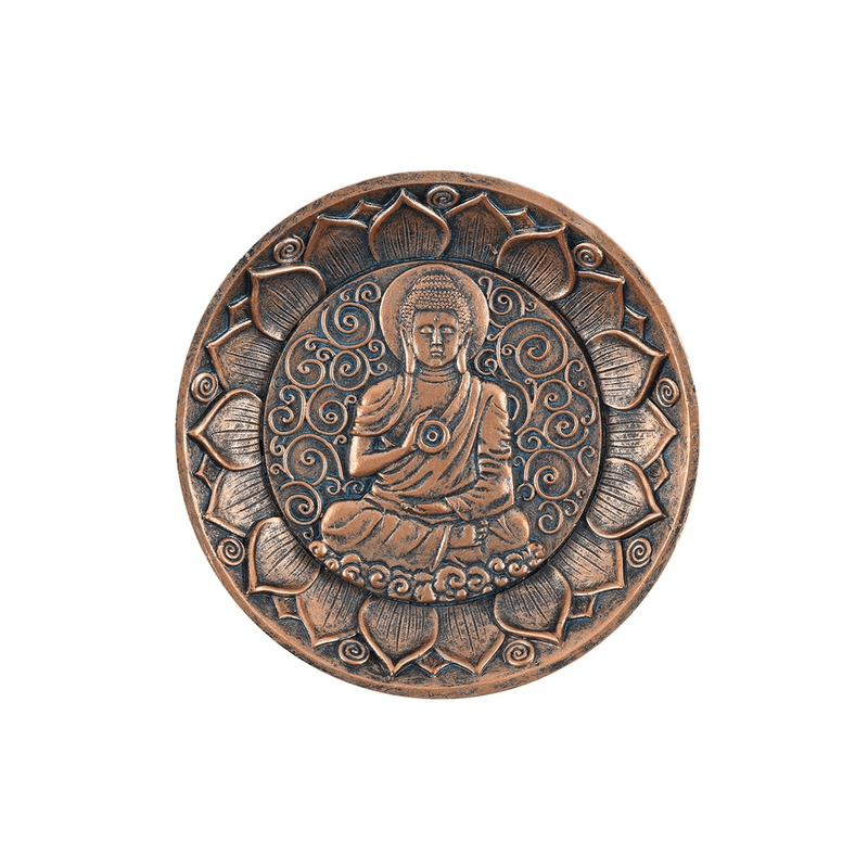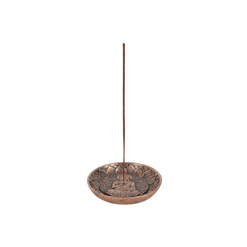 Detailed Buddha design incense holder in an antique copper effect finish. Holds one incense stick at a time. Product Dimensions: H2.5cm x W12.5cm x D12.5cm Packaged Dimensions: H3cm x W13.5cm x D13.5cm