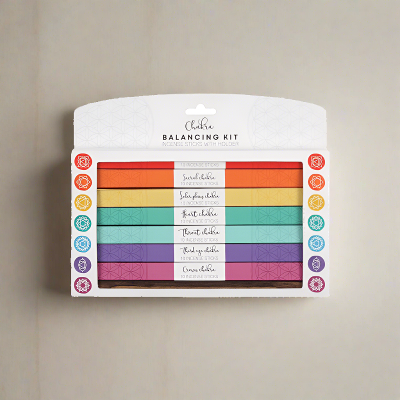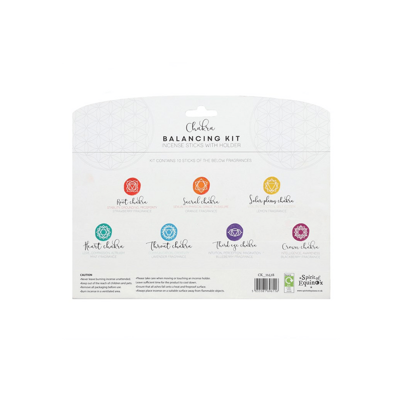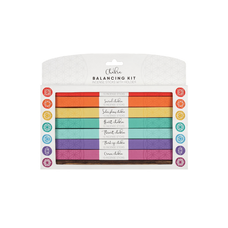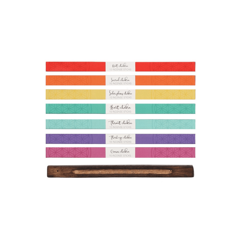 This Chakra Incense Balancing Kit contains 7 individual packs of 10 incense sticks. Each pack represents one of the seven chakras and a different fragrance; Root - Strawberry, Sacral - Orange, Solar Plexus - Lemon, Heart - Mint, Throat - Blueberry, Third Eye - Lavender, Crown - Blackberry. Wooden Incense holder included. Product Dimensions: H22cm x W27cm x D2cm Packaged Dimensions: H22cm x W27cm x D2cm