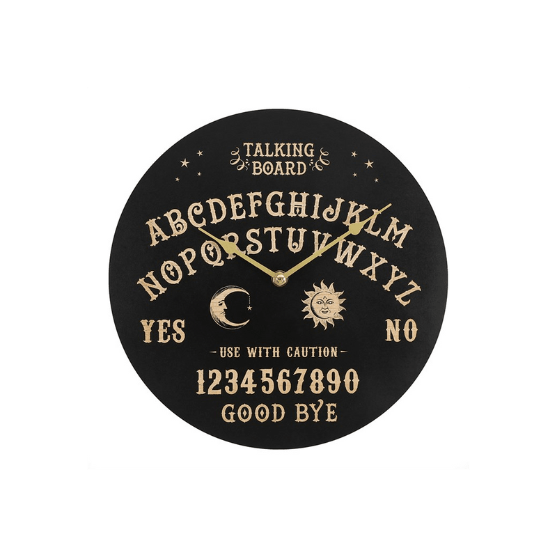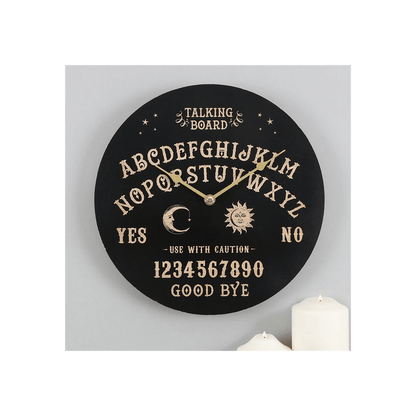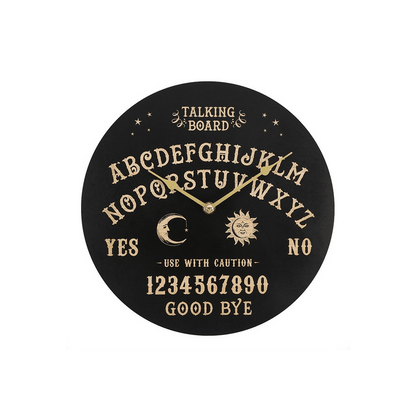 A great 'talking' piece, this circular wall clock has a classic spirit board design which is just the thing for creating an eccentric or mystical ambience. Product Dimensions: H29cm x W29cm x D4cm Packaged Dimensions: H30cm x W29.5cm x D5cm