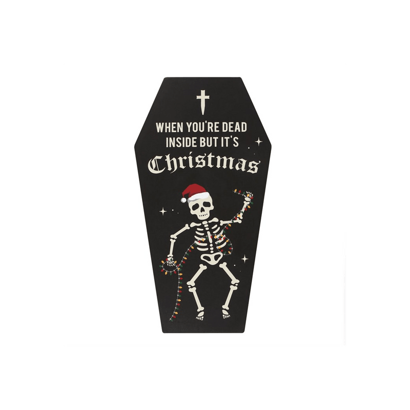 A fun and unusual alternative to standard Christmas decor this coffin-shaped wall plaque features a festive skeleton wrapped in a string of fairy lights with the text 'When you're dead inside, but it's Christmas' This gothic take on Christmas is perfect for the dark and edgy. Product Dimensions: H30cm x W16cm x D1.1cm Packaged Dimensions: H30cm x W16cm x D1.1cm