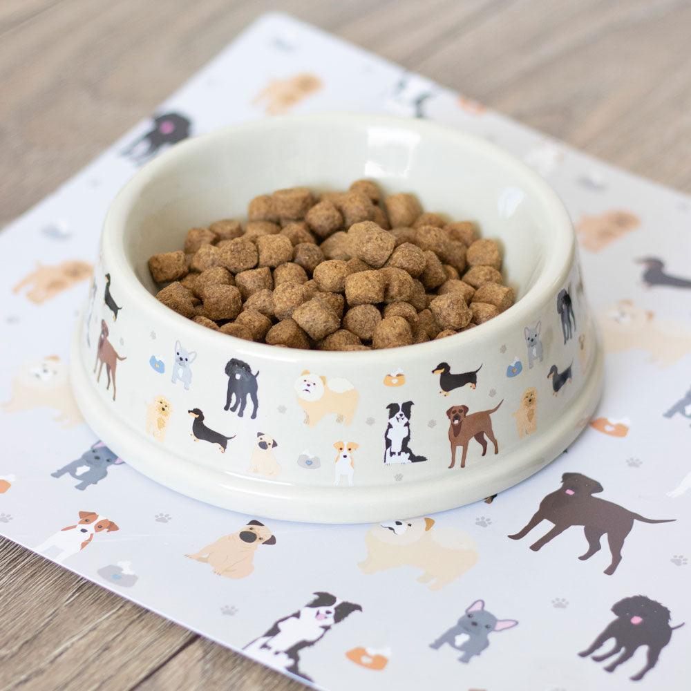 Ceramic dog food bowl with dog breed illustrations for a decorative touch. A thoughtful gift idea for a new pet and sure to be appreciated by any dog-lover and their four-legged friend. Product Dimensions: H5.7cm x W18.5cm x D18.5cm Packaged Dimensions: H6.3cm x W19.2cm x D19cm