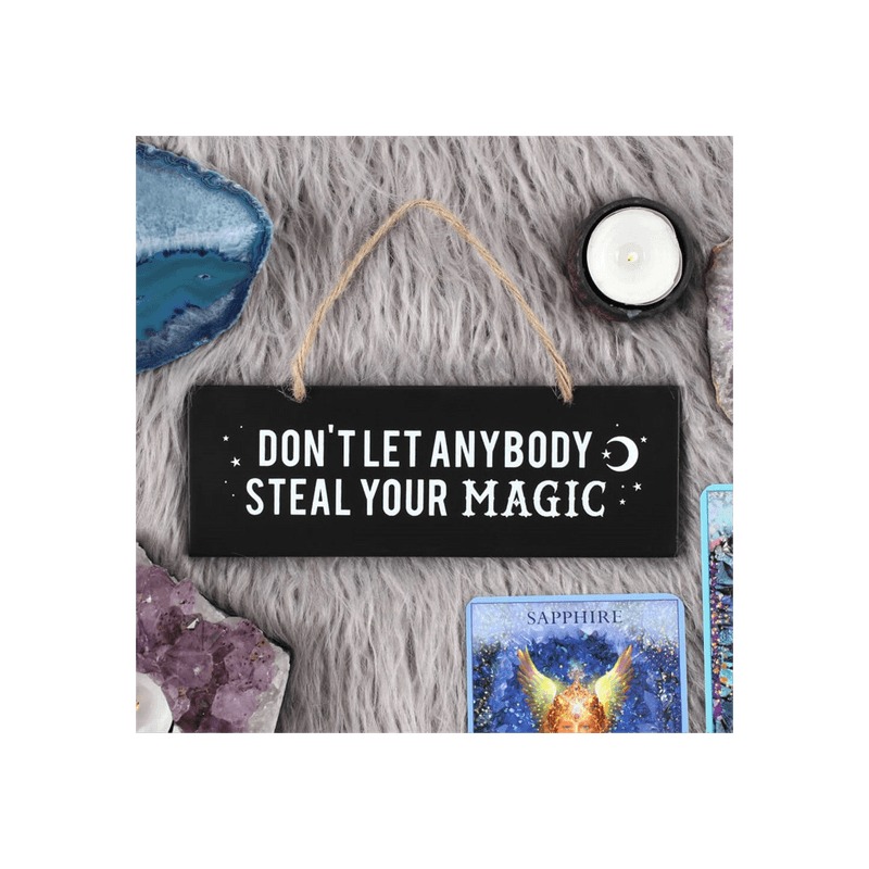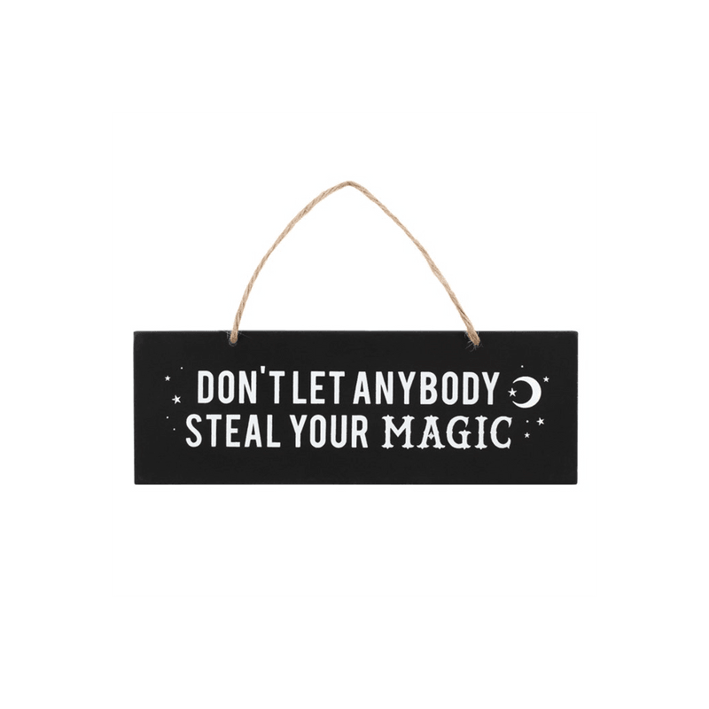 Black hanging wall sign featuring the text 'Don't let anybody steal your magic'. Product Dimensions: H7cm x W20cm x D1cm Packaged Dimensions: H9.5cm x W23cm x D1cm