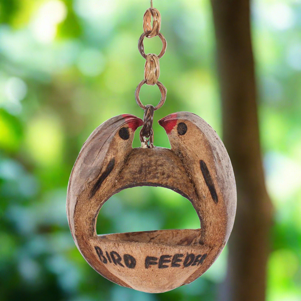 This ethically sourced bird feeder has been handcarved from a coconut shell. The bird on either side helps to balance the feeder and protect the seeds from wind and rain. Product Dimensions: H20cm x W14.5cm x D13cm Packaged Dimensions: H20cm x W14.5cm x D13cm