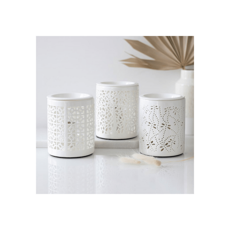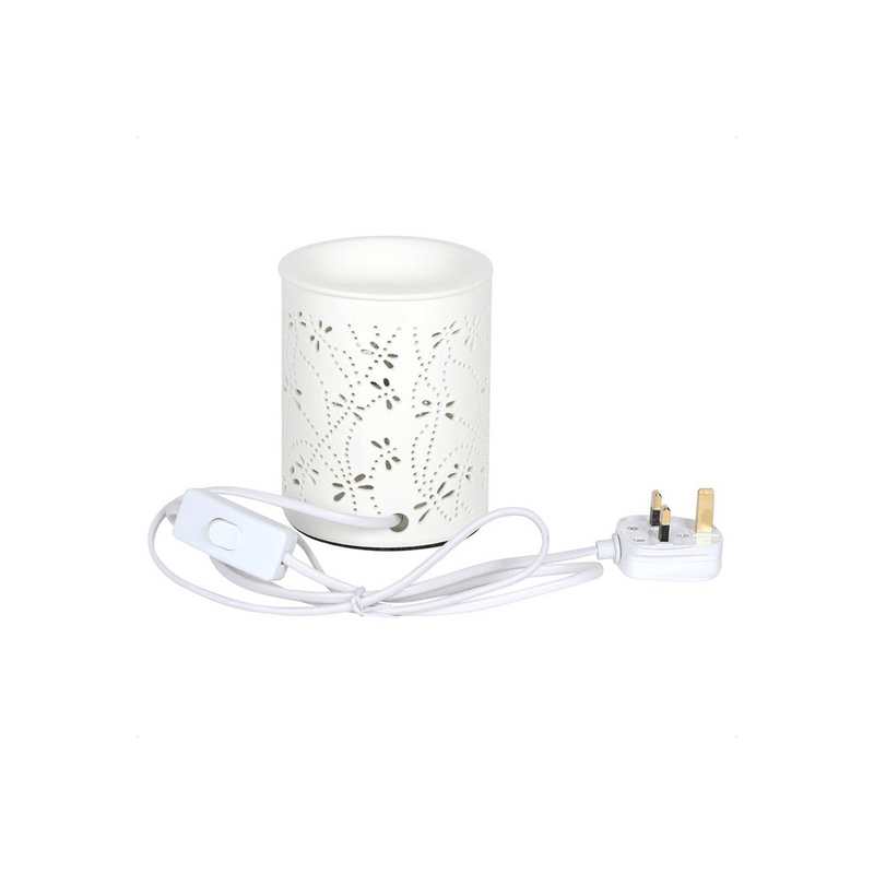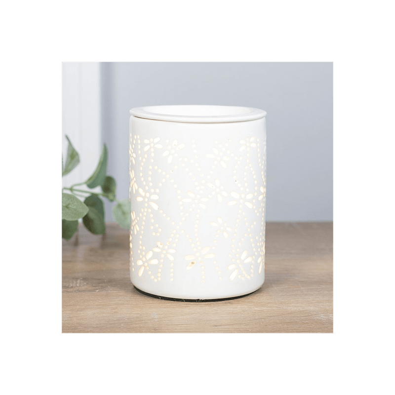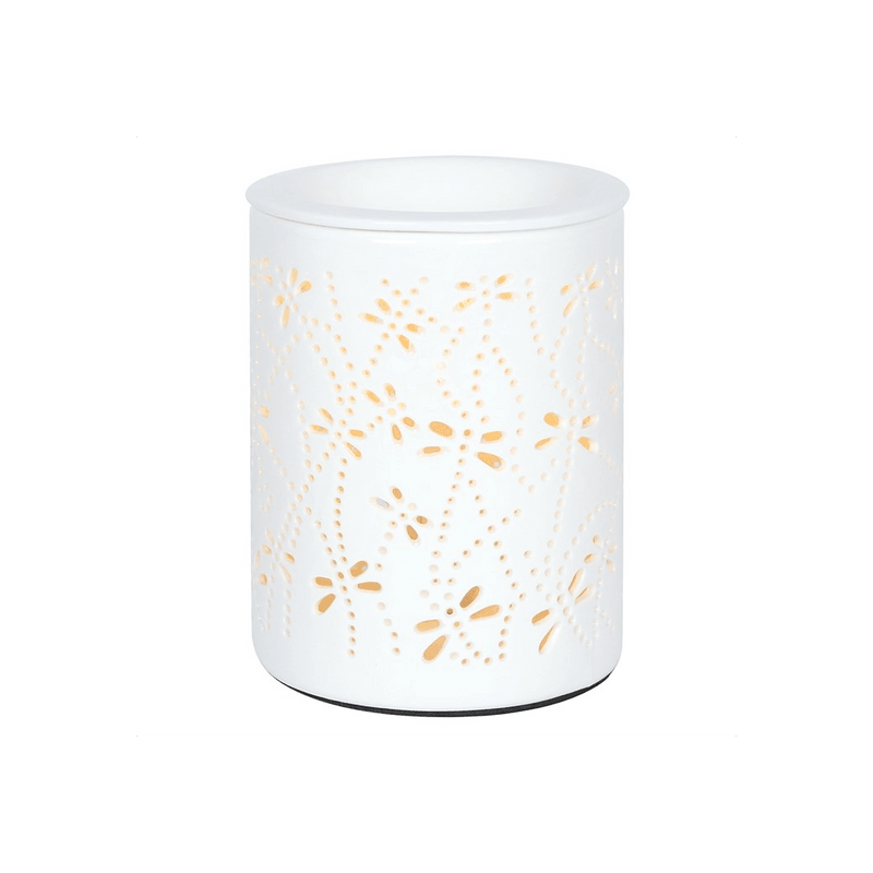 This elegant, electric oil burner lights up to showcase a sweet dragonfly pattern and is compatible with both scented fragrance oils and wax melts. To use, place on a level and heat resistant surface before placing oil or wax melts in ceramic dish and plugging in burner. Unplug when not in use and let cool completely before moving or cleaning removable dish with warm, soapy water. Electrical safety tested. On-off switch. Class 2 equipment, European conformity, 220-240 voltage, frequency 50Hz, supplied with a 25w bulb but can be used with bulbs up to 40w. Do not use near water. Please note that the oil burner does take around 10-20 minutes to heat up fully ready to melt wax and release the fragrance. Depth of dish - 2cm. Product Dimensions: H13cm x W10.5cm x D10.5cm Packaged Dimensions: H17.5cm x W13cm x D13cm