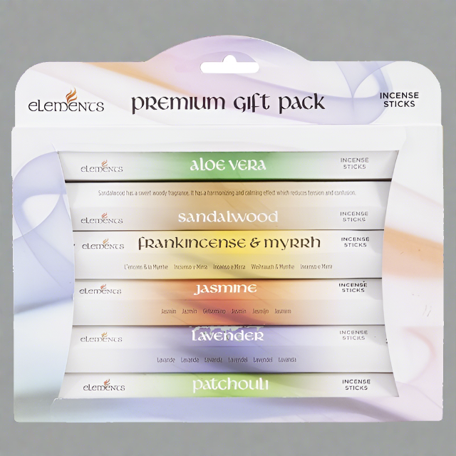 A box of 6 assorted packs of Premium fragrance range incense sticks by Elements. Each pack contains 20 incense sticks. Packaged Dimensions: H22.5cm x W24.8cm x D3cm