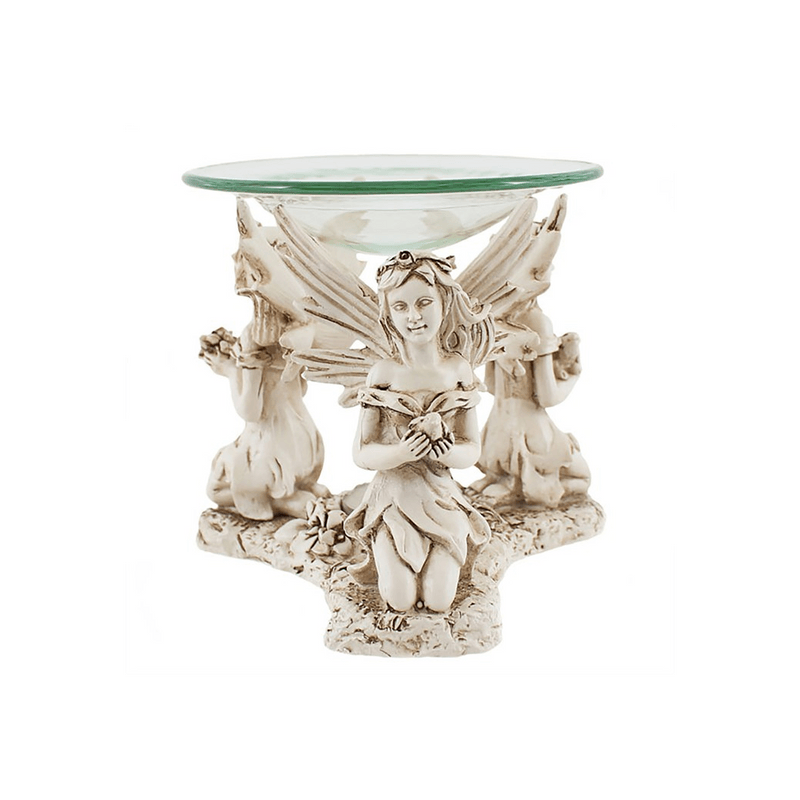 A resin oil burner featuring three fairies in the design. When not in use as an oil burner the glass dish can be removed and the item could be used as a tealight holder. This item can also be used as a wax melt burner however it is advisable to consider the size and depth of the bowl when adding wax to ensure it will not overrun the edges when melted.Product Dimensions: H11.5cm x W13cm x D13cm Packaged Dimensions: H16cm x W15cm x D15cm