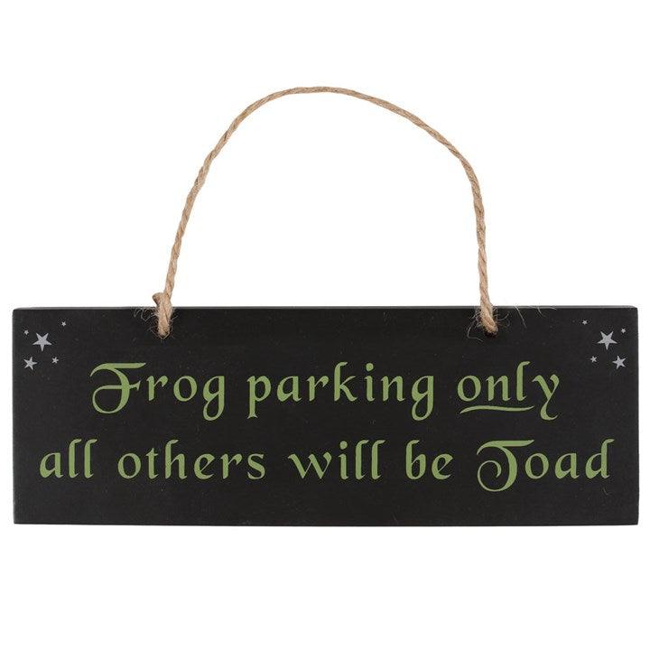 Hanging decorative sign featuring the wording 'Frog Parking Only All Others Will Be Toad'. A great piece for any witch's garden and sure to raise a smile. Product Dimensions: H7cm x W20cm x D0.8cm Packaged Dimensions: H7cm x W20cm x D0.8cm