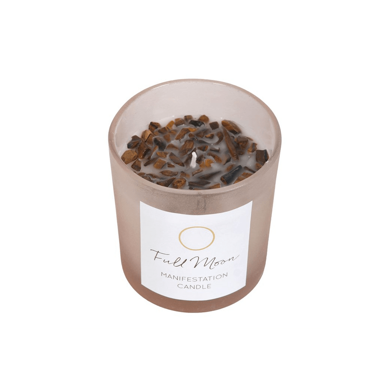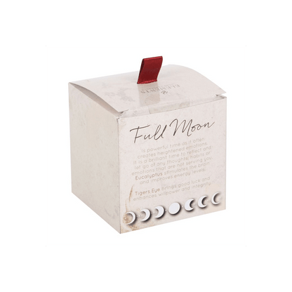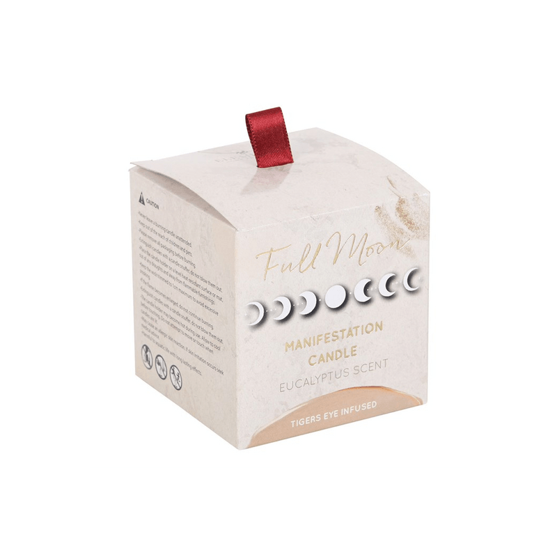 Full Moon Eucalyptus Manifestation Candle with Tiger's Eye. Unleash the powerful benefits of eucalyptus and the manifestation properties of Tiger's Eye with our Full Moon Candle.