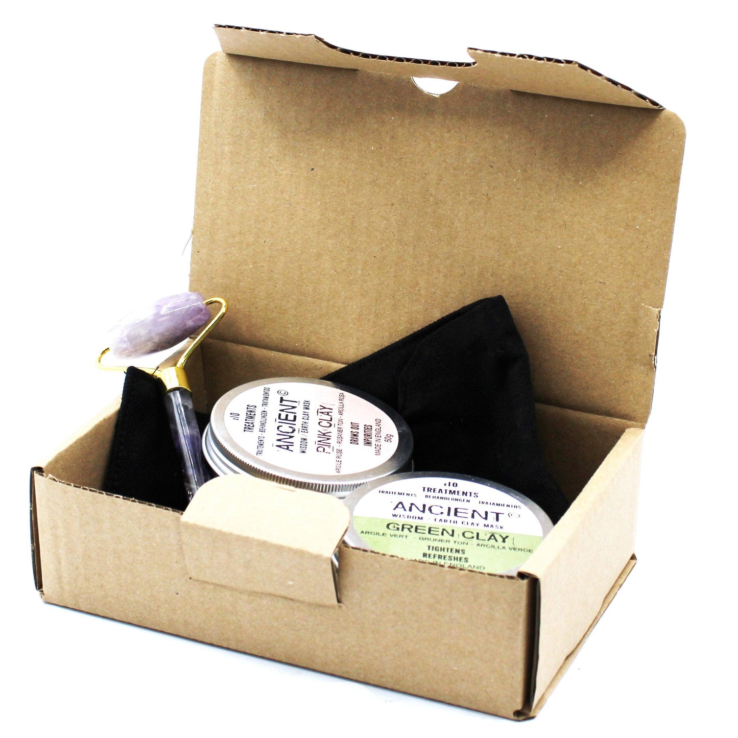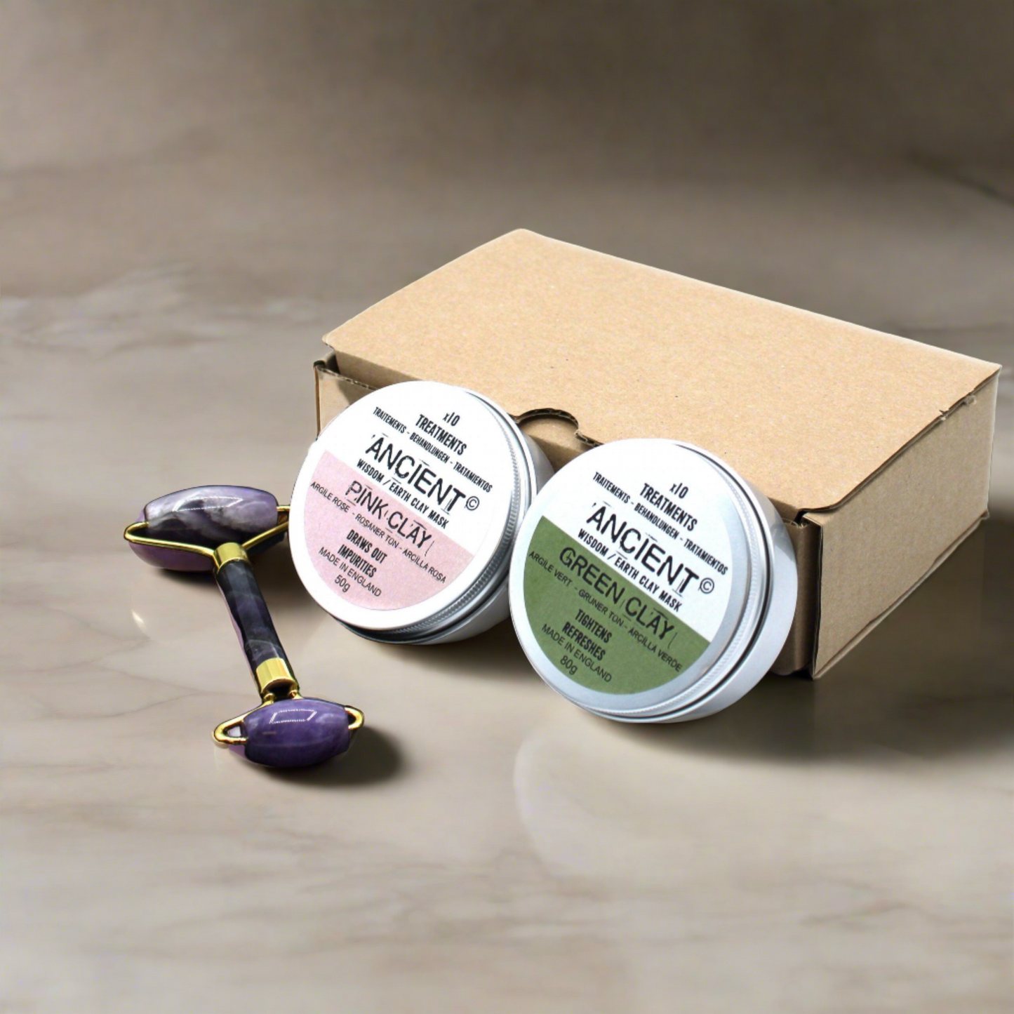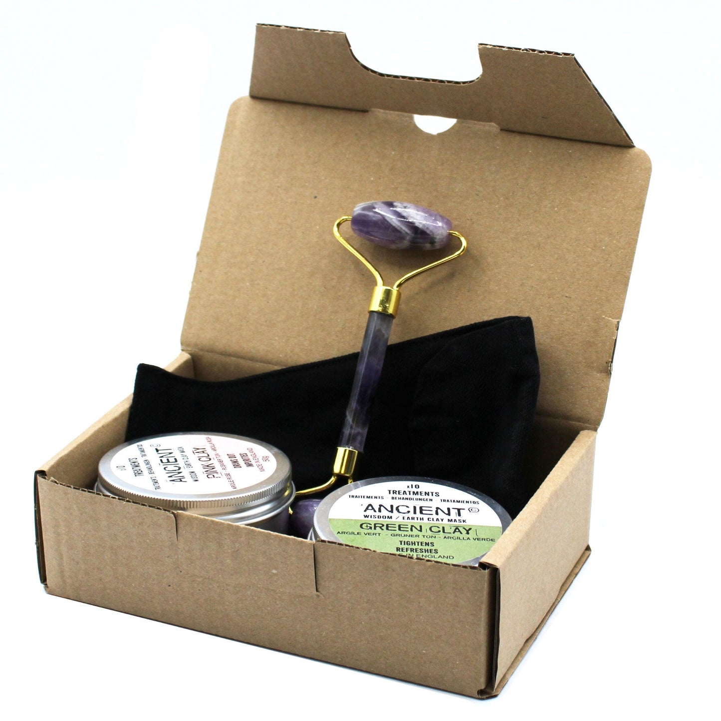 Introducing the Gemstone Roller & Clays gift set! This beautiful set comes pre-boxed, shrink wrapped, and labeled, making it the perfect gift for any occasion. The set includes:1x GemFR-03 - Amethyst roller & pouch1x Green Clay1x Pink ClayThe Gemstone Roller & Clays gift set is a great way to introduce someone to the benefits of using gemstone rollers and clay masks. The amethyst roller is said to promote relaxation and stress relief, while the green and pink clays are perfect for detoxifying and cleansing the skin. Give the gift of relaxation and beauty today!