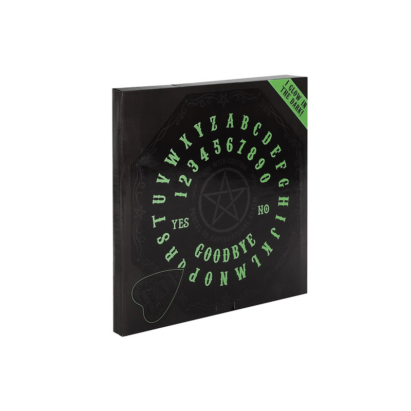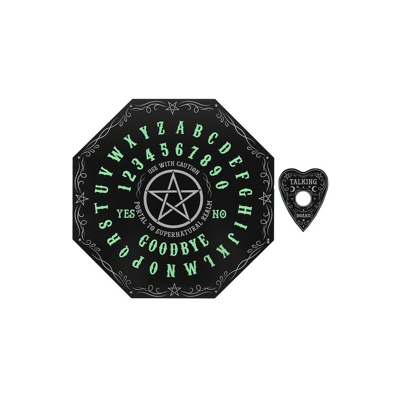An octagon shaped spirit board with a Pentagram design and glow in the dark letters and numbers. Comes with a planchette for readings during spiritual connections. Product Dimensions: H1cm x W40cm x D40cm Packaged Dimensions: H3cm x W41cm x D41cm