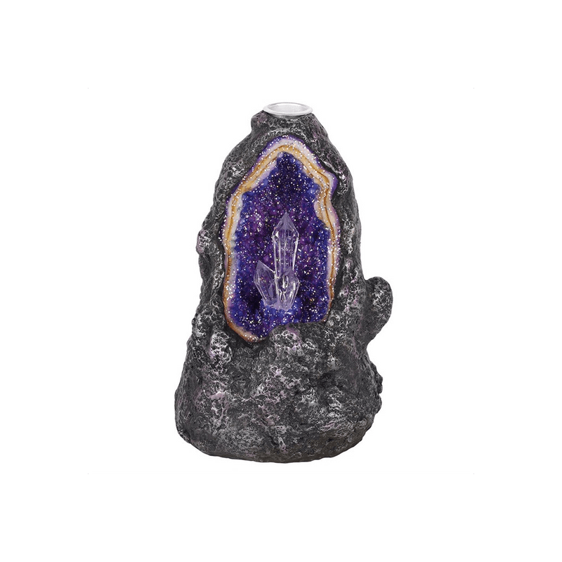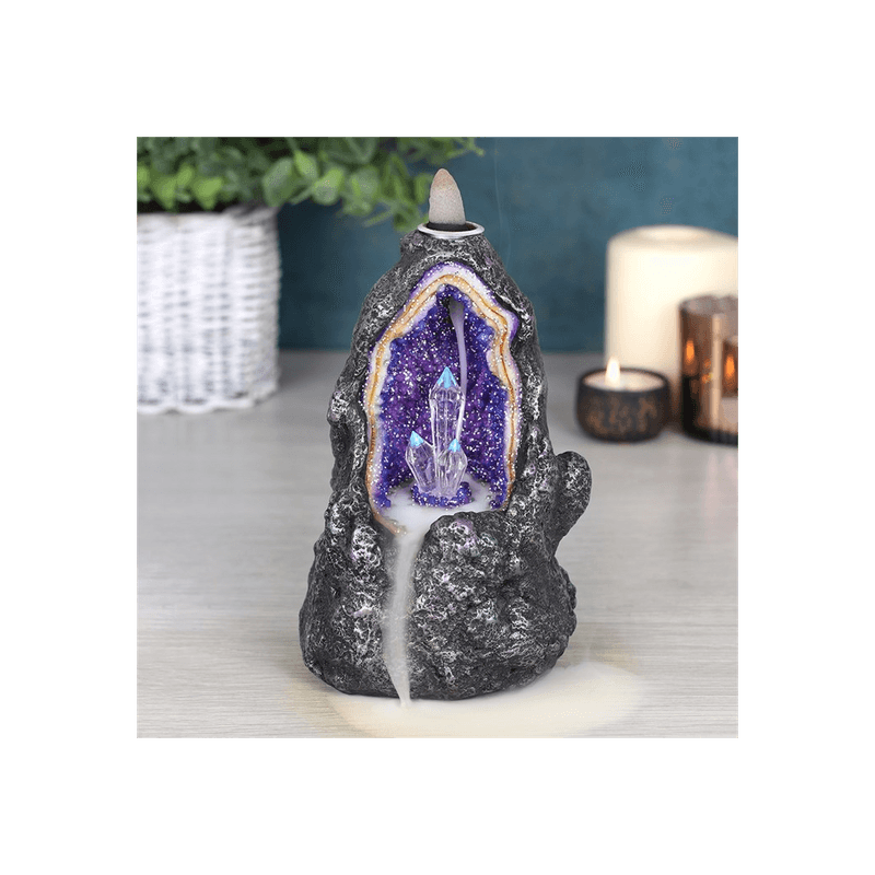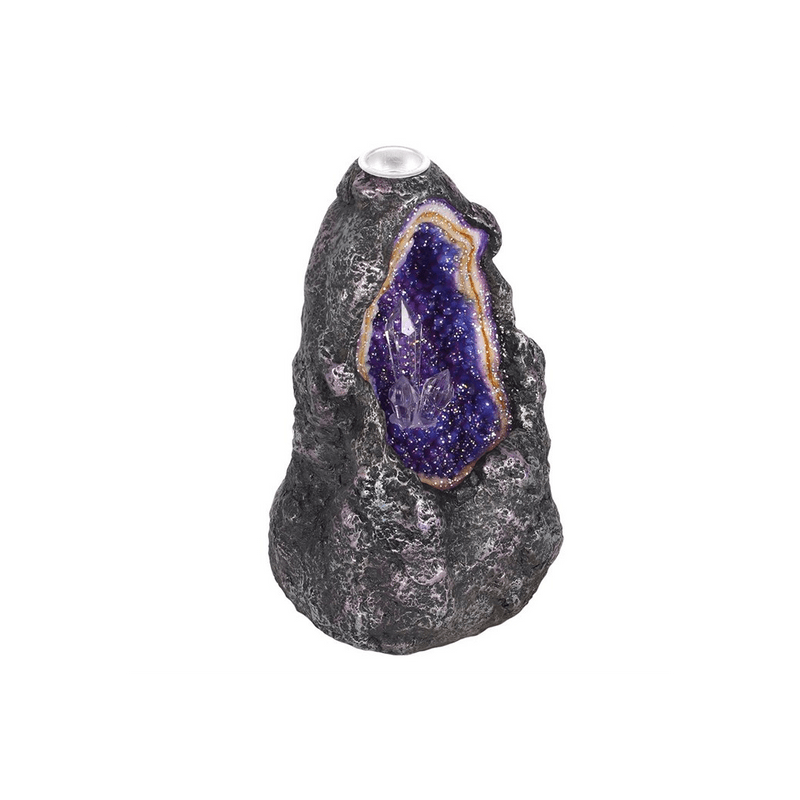 An intricate and impressive backflow incense burner in a glowing cave design. This burner features glowing crystals which change colour in a geode-like opening. When the cone is lit the smoke from the cone cascades downwards in a mesmerising waterfall effect to pool at the bottom. Beautiful to watch. For best effects burn indoors in an area away from any sudden air movements.Please note that after burning it is normal for a light oily residue to appear on the oil burner, for this reason we recommend protecting any furniture it is placed upon suitably. The residue can be easily wiped off the burner with a damp cloth. Please exercise caution when burning incense. Requires 2X AA batteries which are not included. Only backflow incense cones should be used with this product ? standard incense cones will not create the desired effect. It is normal for cones to take up to 10 minutes after being lit to start creating the smoking/mist effect. We supply a selection of backflow incense cones in a variety of scents. Product Dimensions: H17cm x W11cm x D10cm Packaged Dimensions: H20cm x W15cm x D13.8cm