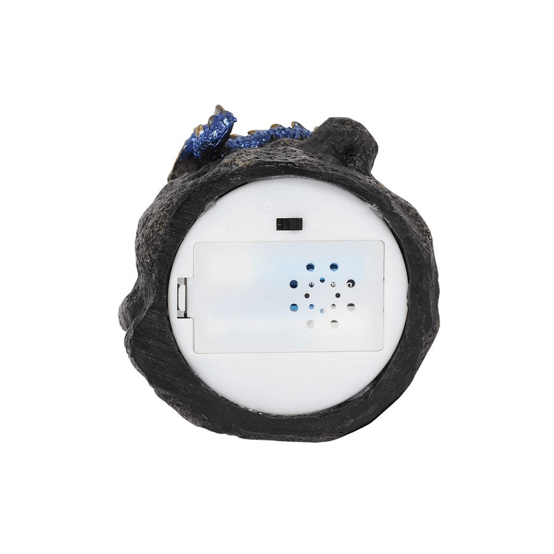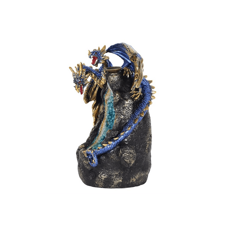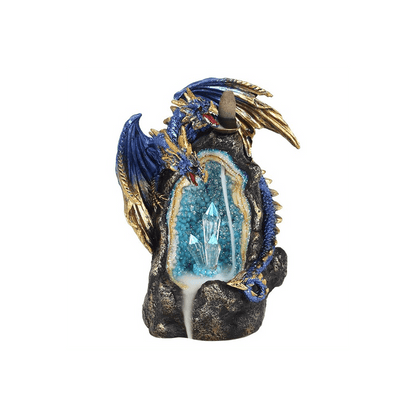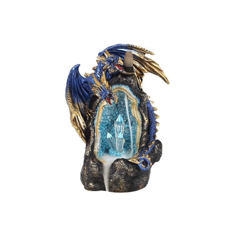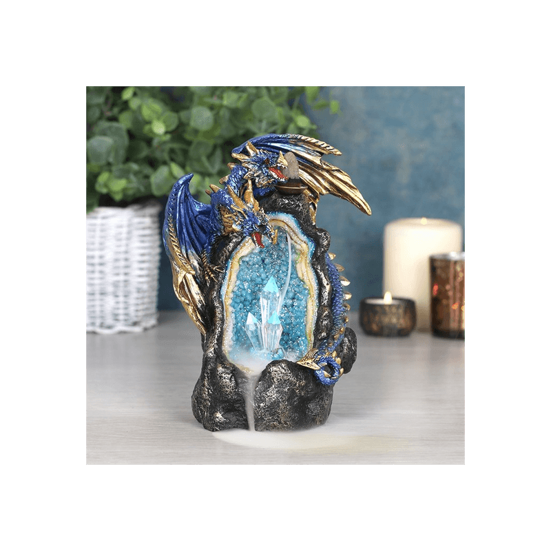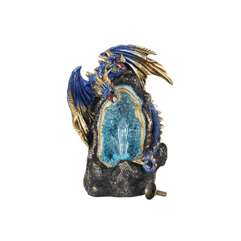 An intricate and impressive backflow incense burner in a glowing dragon cave design. This burner features glowing crystals which change colour in a geode-like opening. When the cone is lit the smoke from the cone cascades downwards in a mesmerising waterfall effect to pool at the bottom. Beautiful to watch. For best effects burn indoors in an area away from any sudden air movements. Please note that after burning it is normal for a light oily residue to appear on the oil burner, for this reason Product Dimensions: H18cm x W12cm x D10cm Packaged Dimensions: H21.5cm x W16.5cm x D12.5cm
