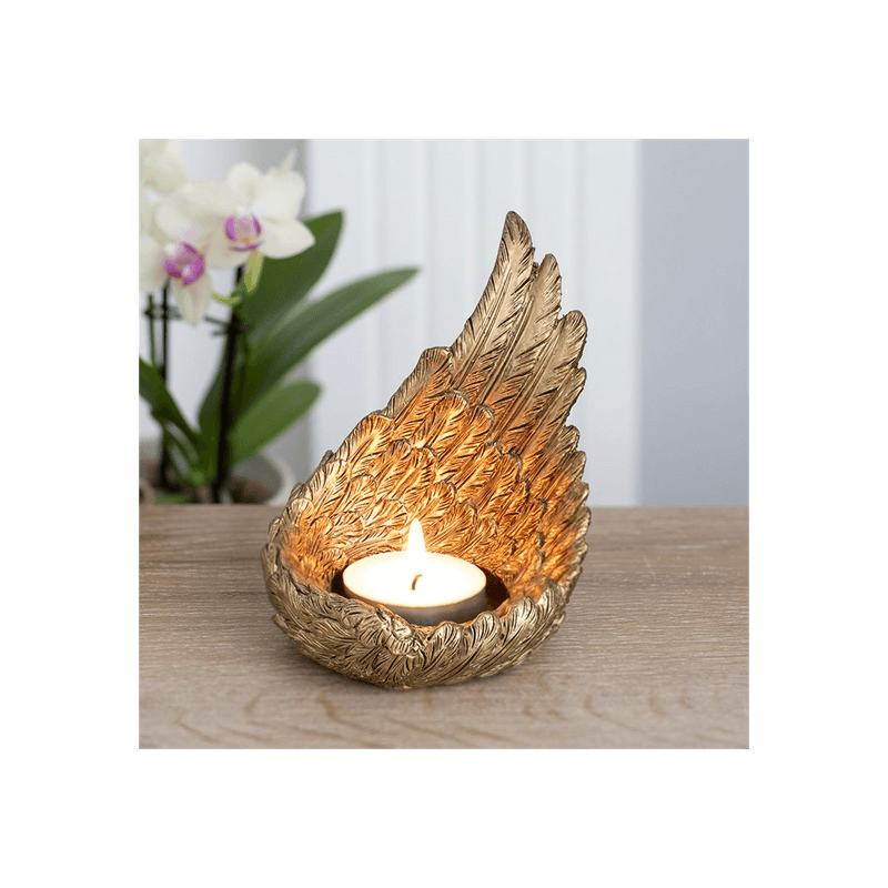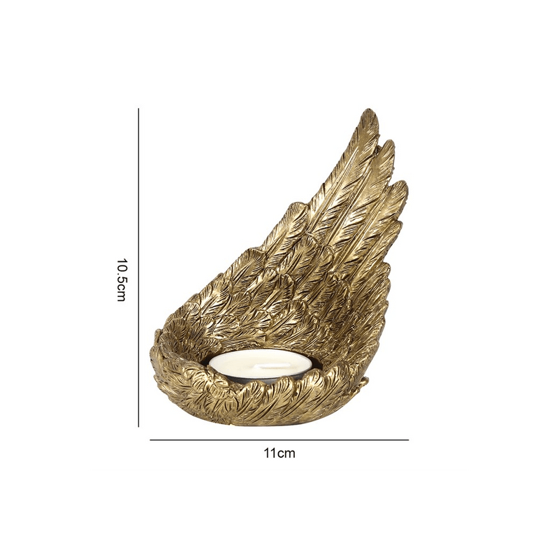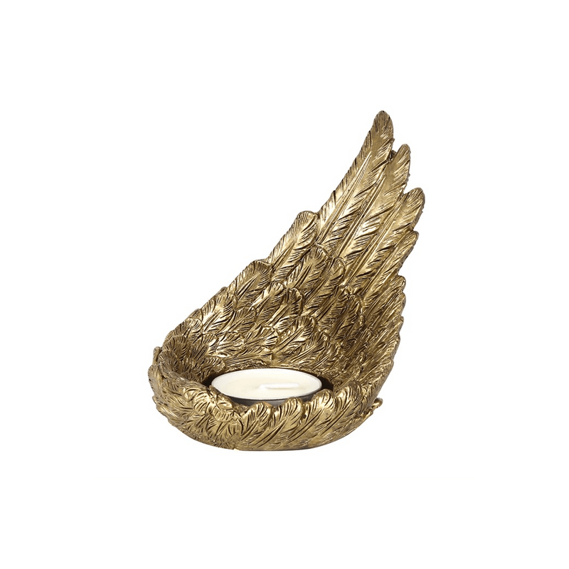 A beautiful, raised angel wing tealight holder in an antique gold finish. Product Dimensions: H10cm x W8.5cm x D10.5cm Packaged Dimensions: H11cm x W11.5cm x D9cm