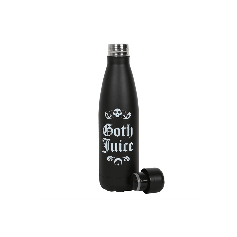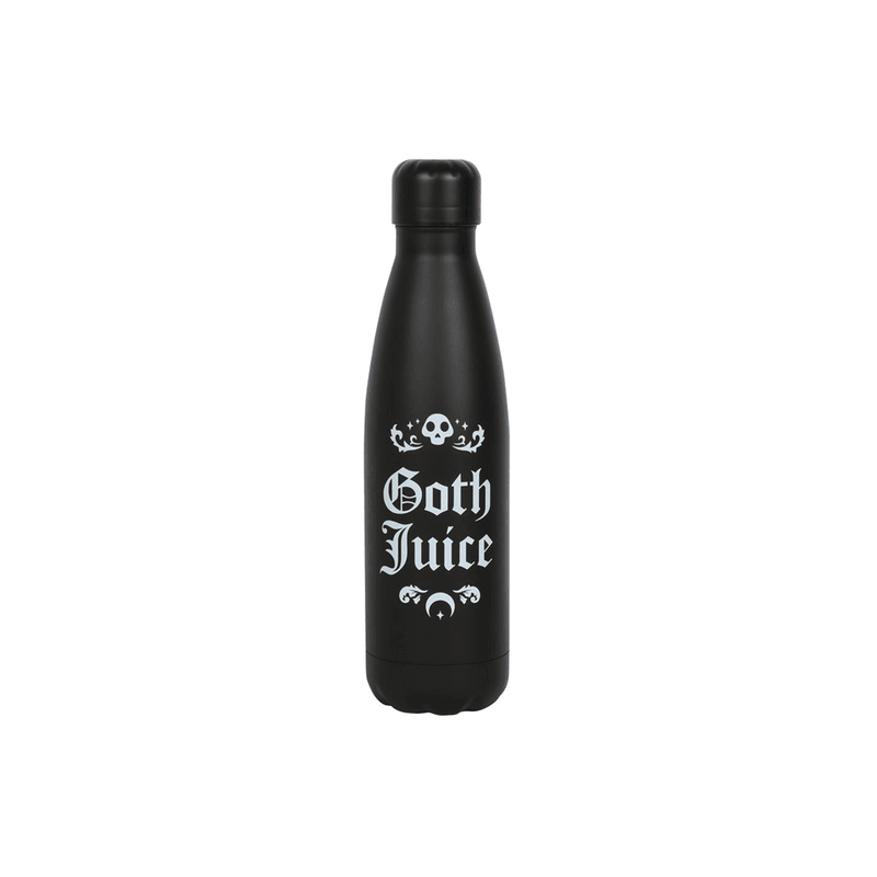 This jet black water bottle features the text 'Goth Juice' in gothic themed text. Hand wash only. 500ml capacity.Product Dimensions: H26.5cm x W7cm x D7cm Packaged Dimensions: H26.7cm x W7.7cm x D7.1cm