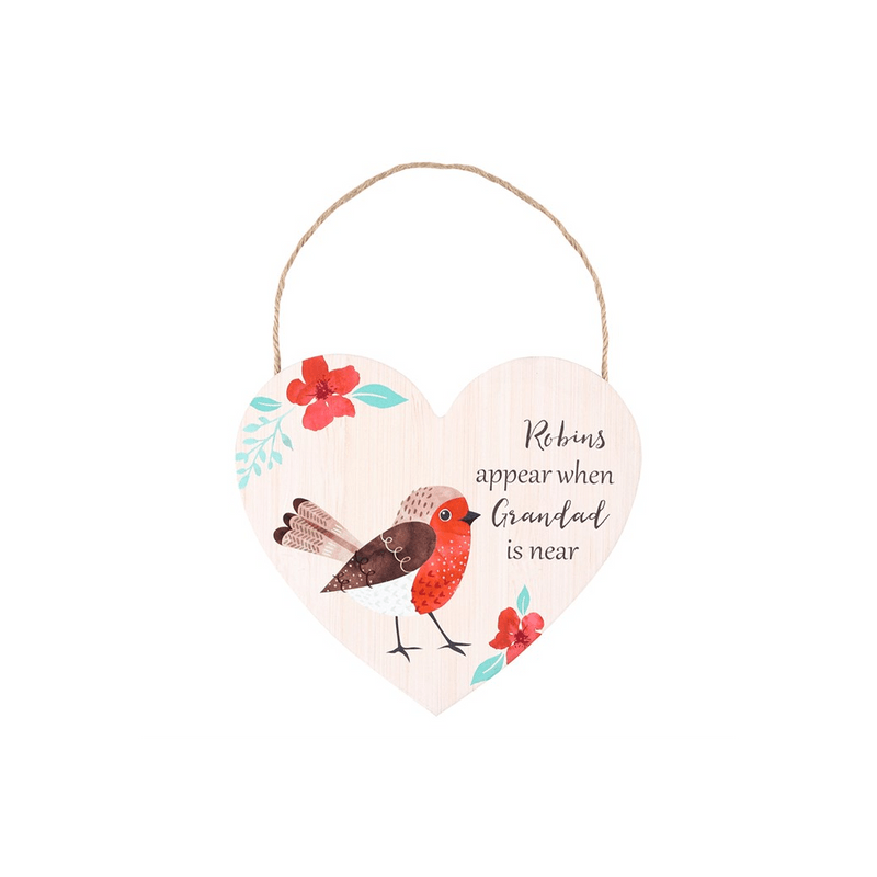 Bring extra love and comfort to those who have lost someone close with this meaningful hanging sign. Features a robin design with 'Robins appear when Grandad is near' text. Robins are said to symbolise angels and new beginnings when times are tough. Product Dimensions: H13.5cm x W15cm x D0.8cm Packaged Dimensions: H13.5cm x W15cm x D0.8cm