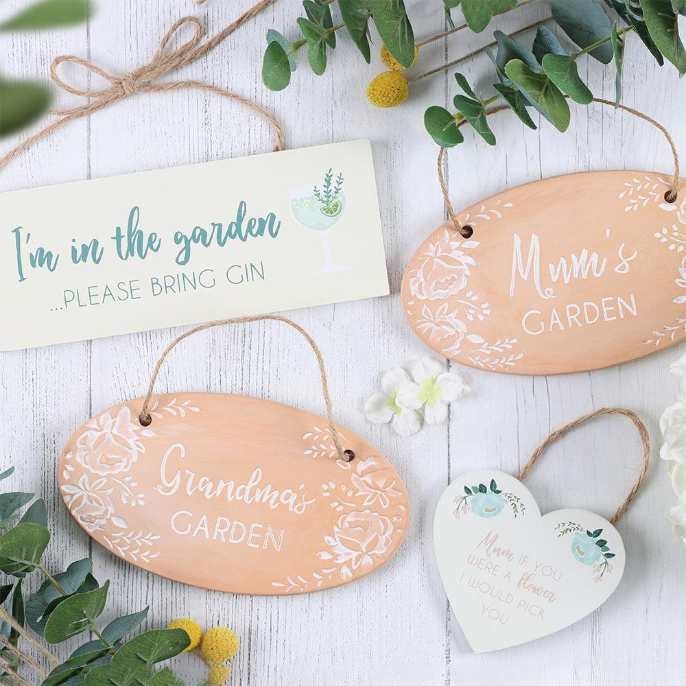 A lovely terracotta hanging sign with twine string ready for hanging. The sign is engraved with a floral design and the words 'Grandma's Garden'. Product Dimensions: H10cm x W18cm x D1cm Packaged Dimensions: H10.5cm x W18.5cm x D1.5cm