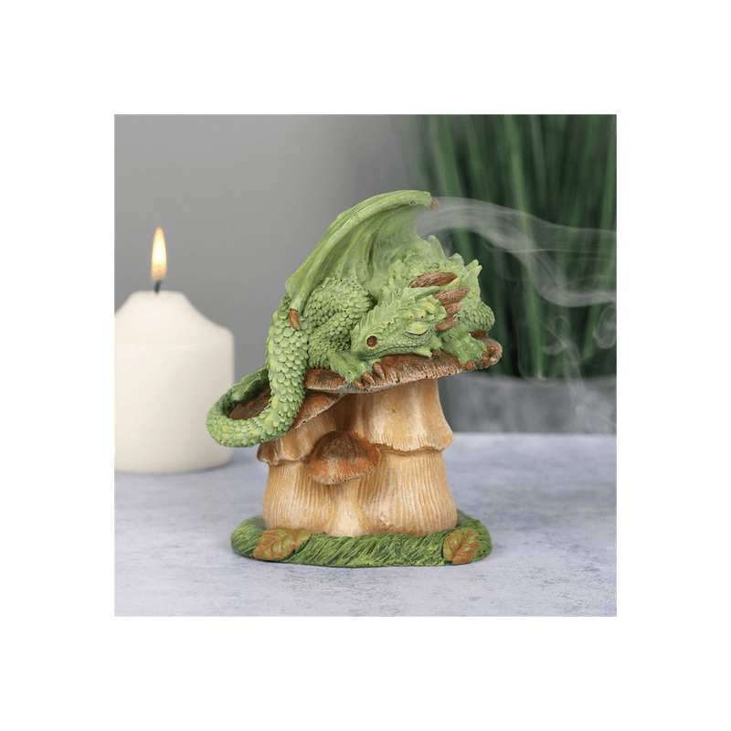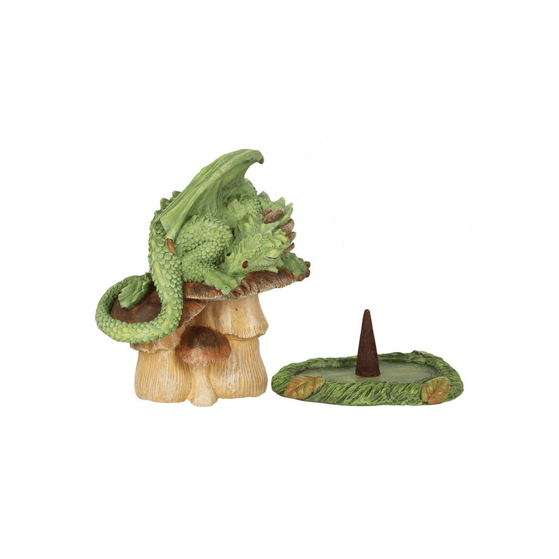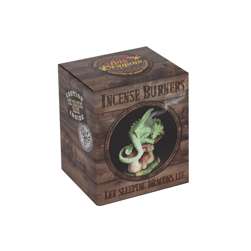 A must-have home fragrance accessory for anyone with an interest in dragons and mythical creatures, this incredible incense cone burner features a sleepy green dragon snoozing on top of a toadstool. When a lit incense cone is place inside the smoke will curl from the dragons nostrils, bringing the piece to life. Product Dimensions: H13cm x W10cm x D8cm Packaged Dimensions: H16cm x W13.5cm x D11cm