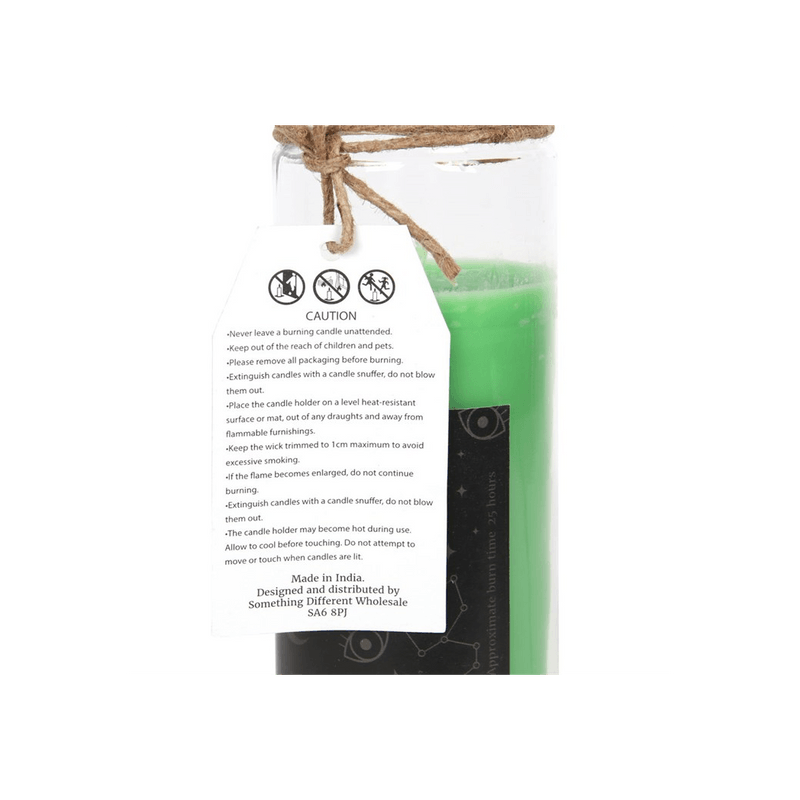 Inspired by traditional 7-day prayer candles, this green pillar candle is contained in a glass jar and scented with green tea making it perfect for accompanying spells for luck and good fortune. Paraffin wax. Average burn time of 70 hours. Product Dimensions: H21cm x W6cm x D6cm Packaged Dimensions: H22cm x W7cm x D7cm