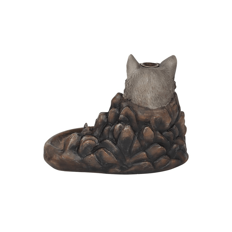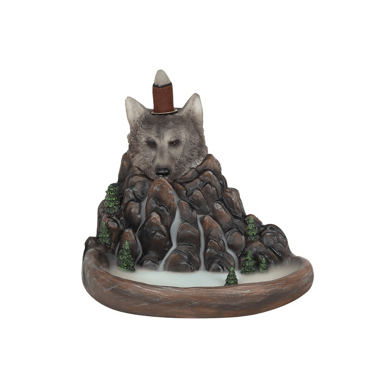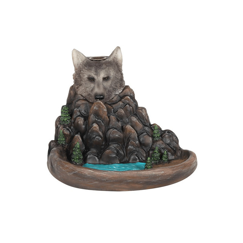 A grey wolf head emerges from tall, rocky cliffs on this unique resin backflow incense burner. To use, place a backflow cone on the wolf's head and watch the smoke stream down the mountainside and pool in the tree-dotted valley down below. Product Dimensions: H13.5cm x W16cm x D12cm Packaged Dimensions: H17.5cm x W20cm x D17.5cm