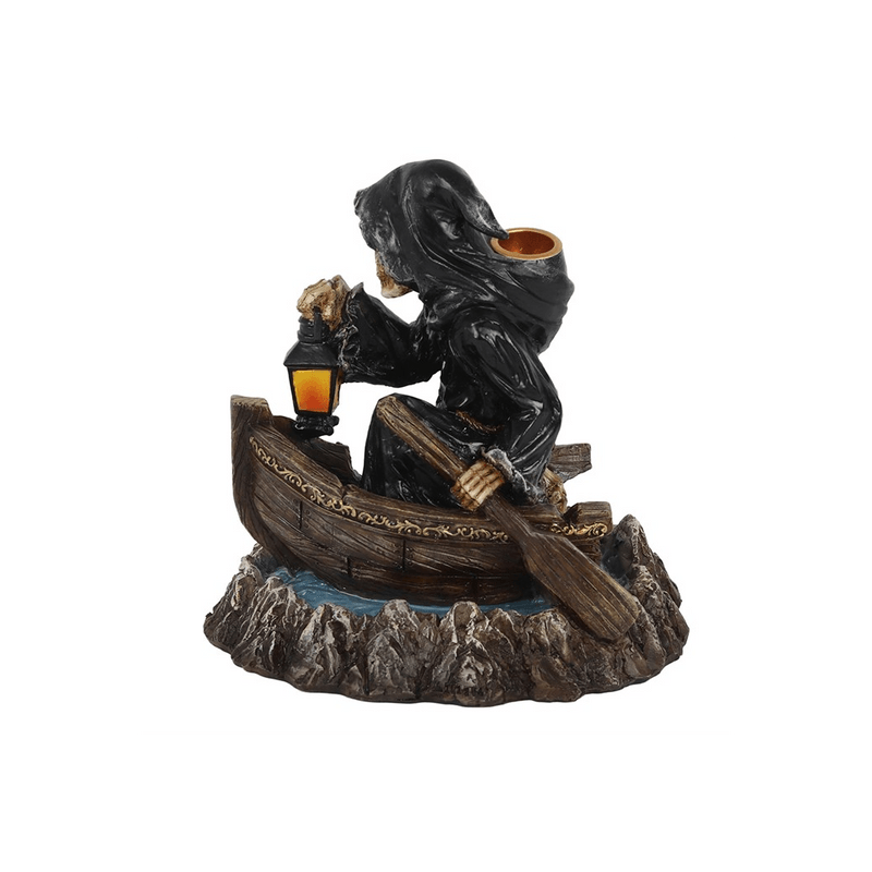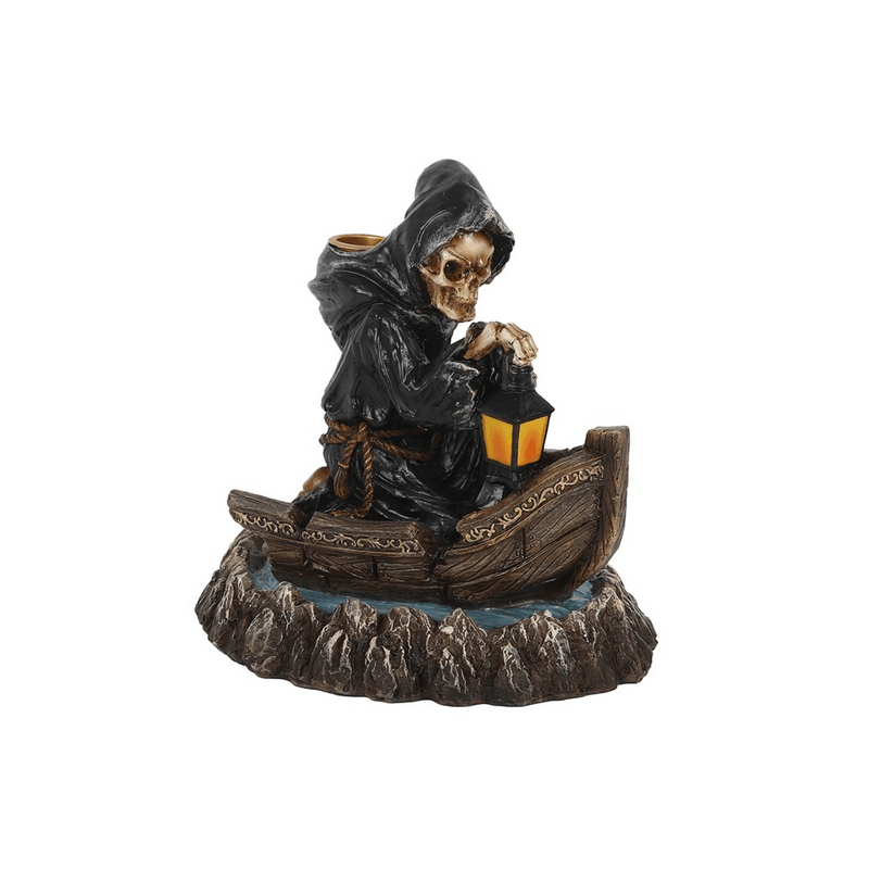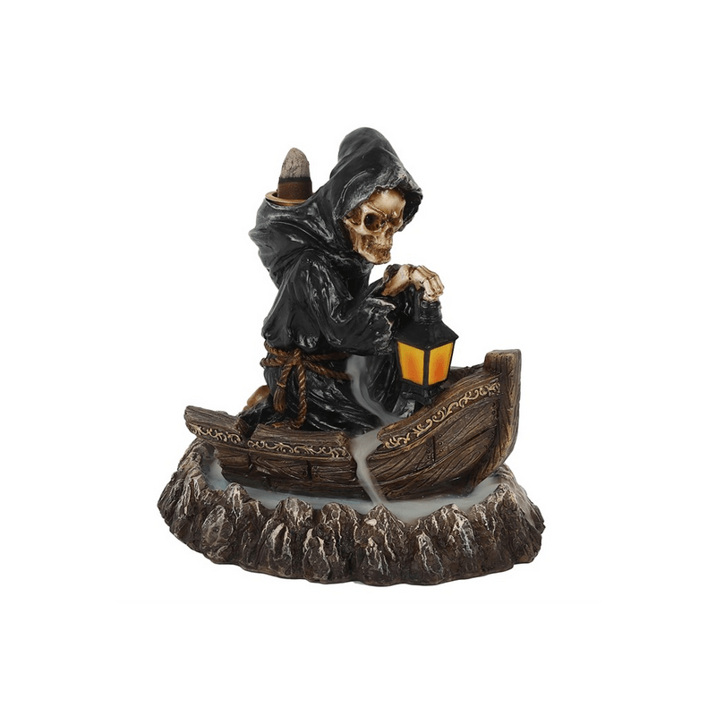 This detailed resin backflow incense cone burner portrays the Grim Reaper crossing the River Styx in a dilapidated boat. Smoke will curl from his robe and pool into a foggy sea when a backflow cone is placed on his back. Product Dimensions: H17cm x W13cm x D16cm Packaged Dimensions: H20cm x W19cm x D17.5cm