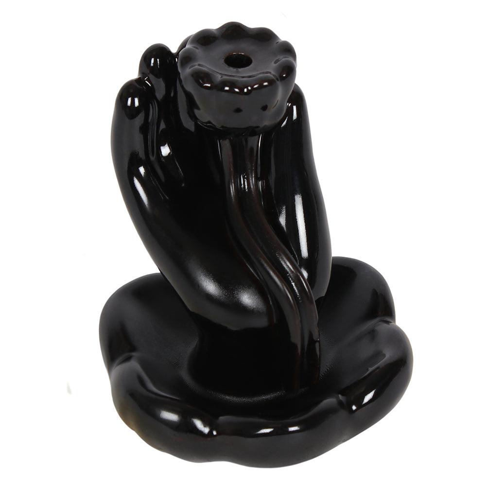 This black ceramic backflow burner is sculpted to show a hand holding a lotus flower. Place a lit backflow cone on top of the flower and watch as the smoke curls downward around the hand and wrist.Product Dimensions: H9cm x W7cm x D7cm Packaged Dimensions: H11cm x W7.5cm x D7.5cm