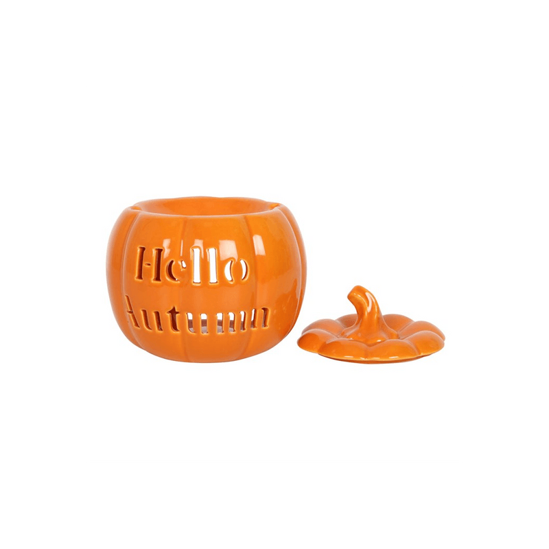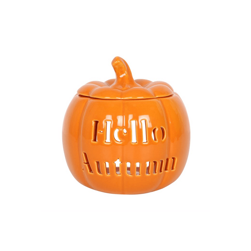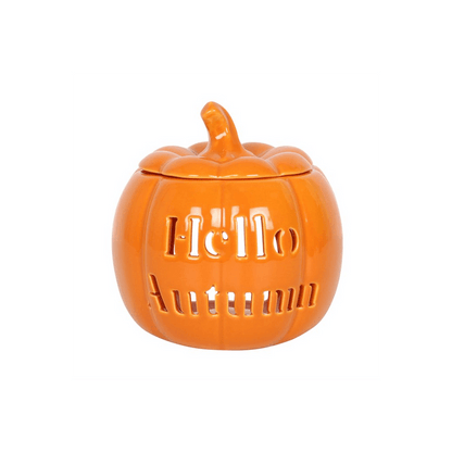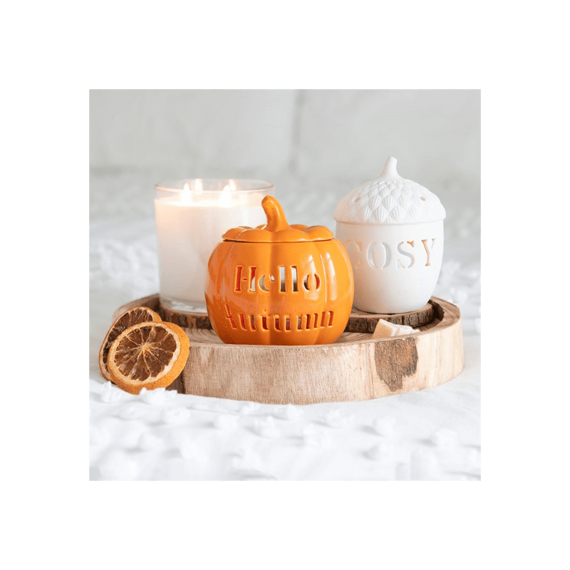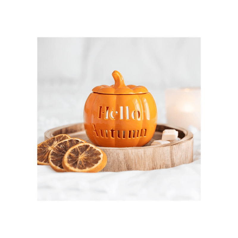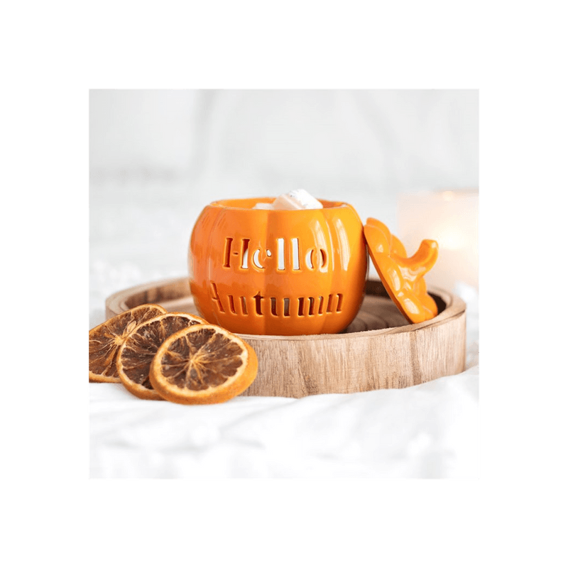 Welcome the autumn season with this charming pumpkin oil burner and wax melt warmer with cut out 'Hello Autumn' text. Use with warm and spicy fragrance oils or wax melts scents to really set a cosy mood.Product Dimensions: H11.5cm x W11cm x D11cm Packaged Dimensions: H15cm x W14.5cm x D15cm