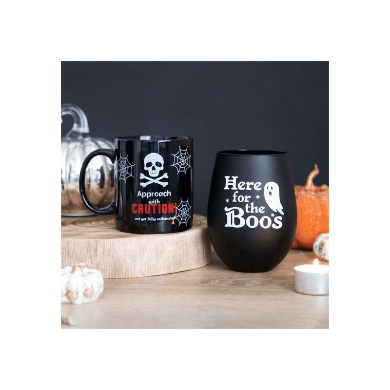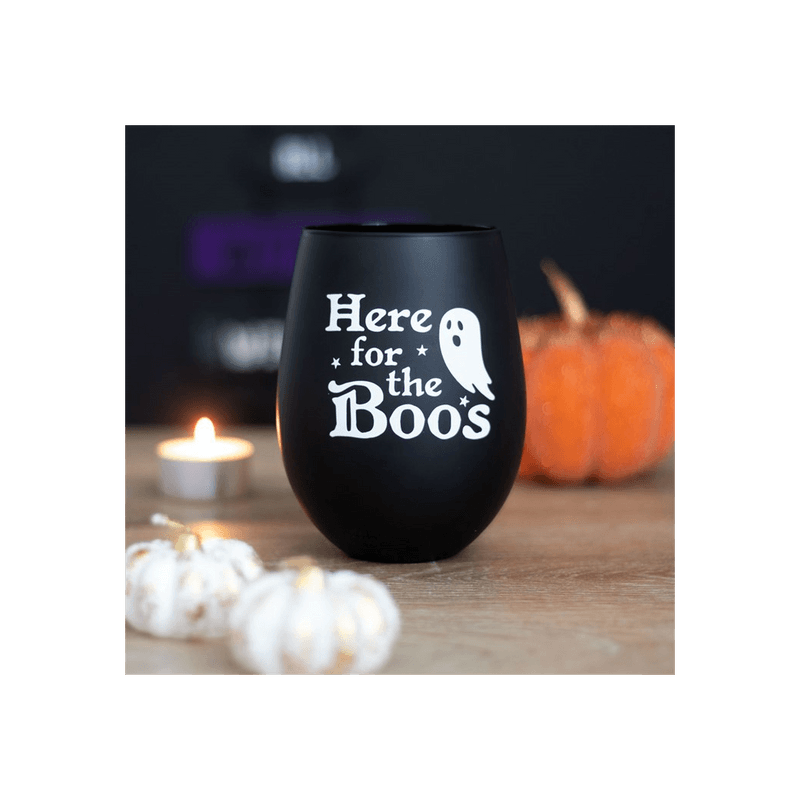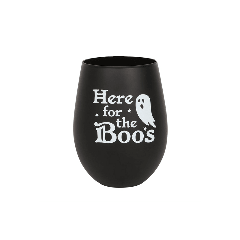 Add your magical cocktail concoctions to this spooky stemless glass featuring the cheeky text 'Here for the Boos'. Ideal for Halloween parties. 500ml capacity. Hand wash only. Product Dimensions: H12cm x W9cm x D9cm Packaged Dimensions: H13cm x W9.5cm x D9.5cm