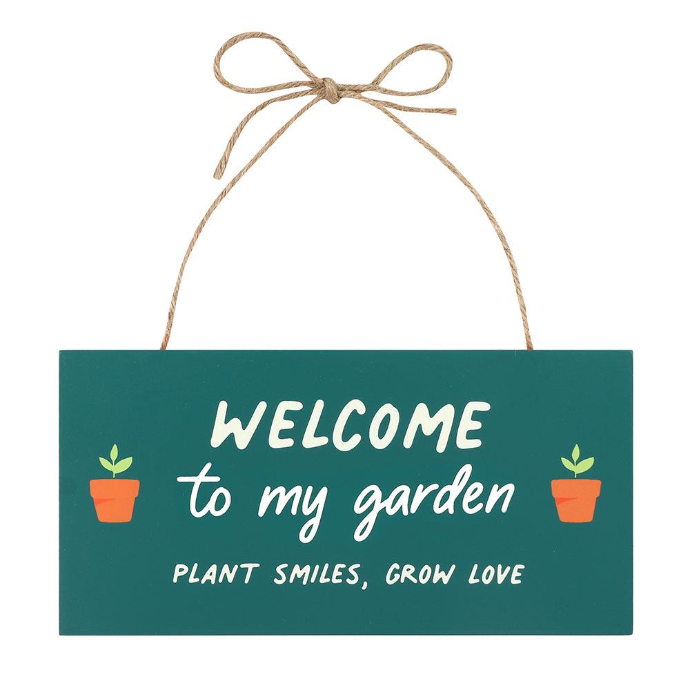 A hanging MDF sign that makes a great gift for a wide variety of gardeners and green thumbs. Features text that reads, 'Welcome to my garden. Plant smiles, grow love'' hung on a hessian string. Measures 20cm when hung. Product Dimensions: H10cm x W20cm x D1cm Packaged Dimensions: H10.5cm x W20cm x D1cm