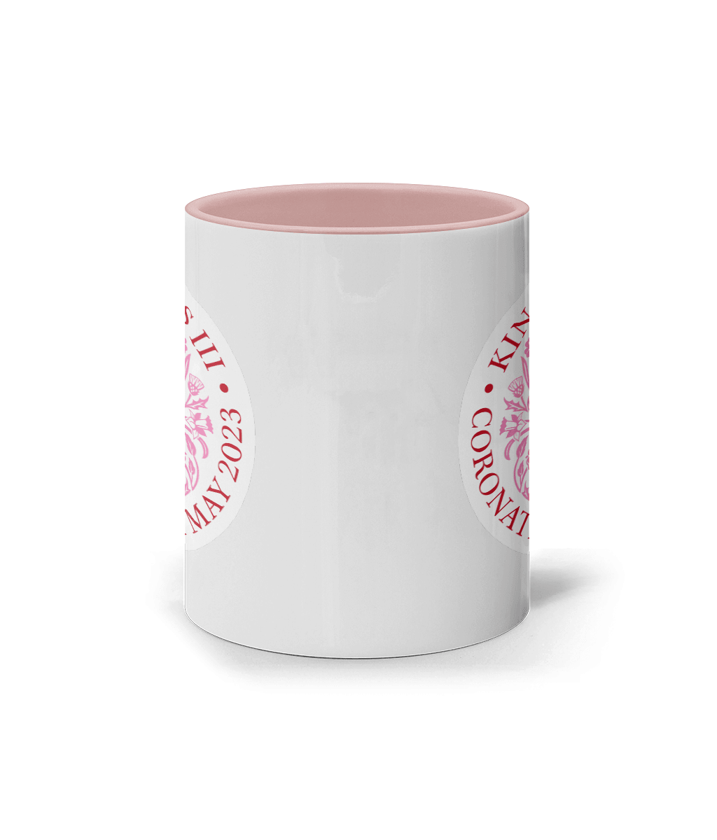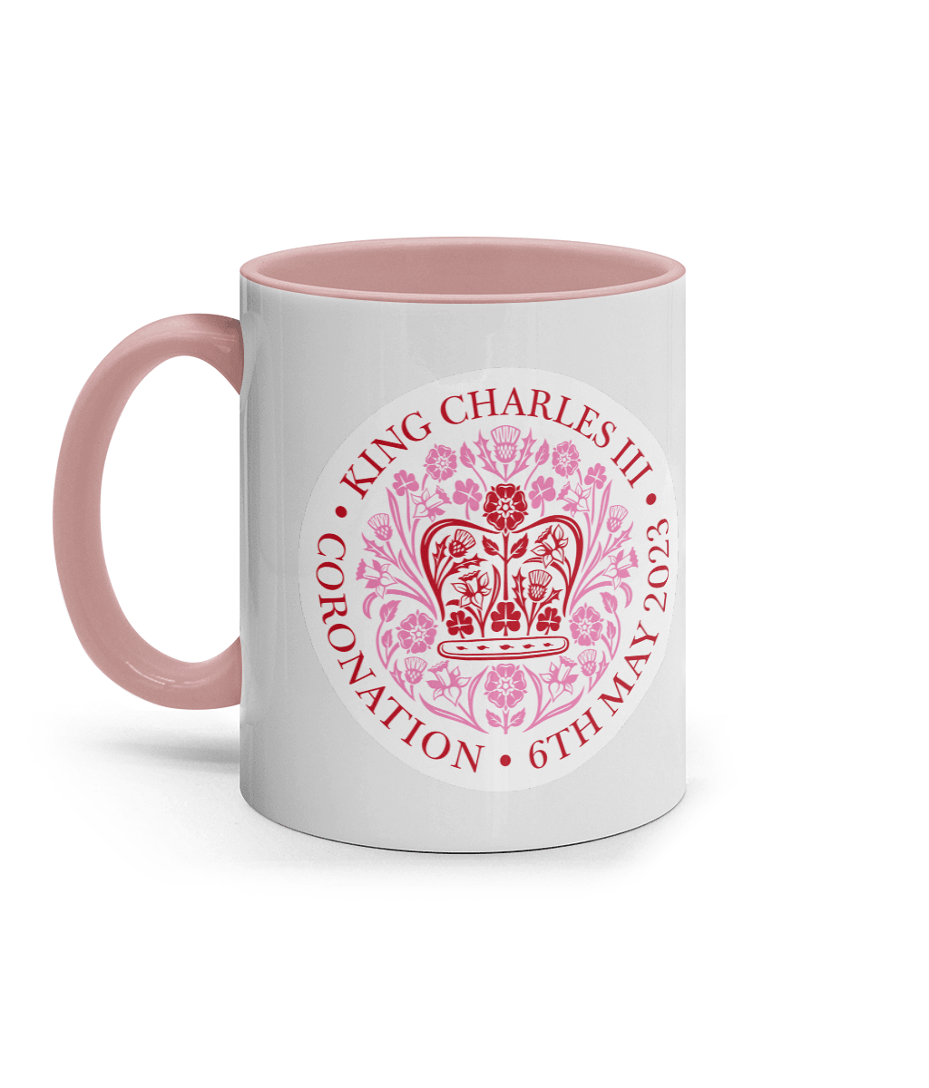 King Charles III Coronation 2023 11oz pink emblem mug. Coronation celebration mug