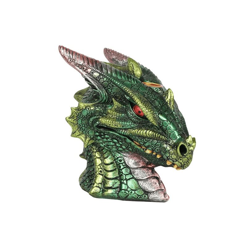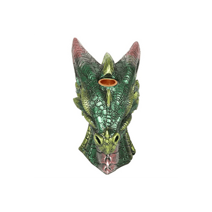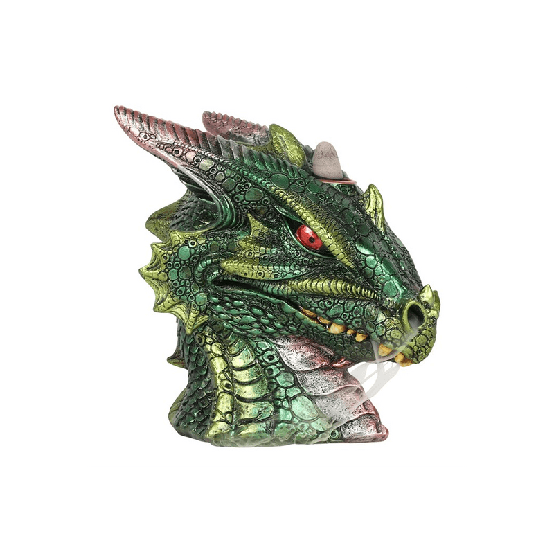 This large green and pink dragon head creates an intricate and beautifully captivating backflow incense burner. Place a backflow incense cone on the dragon's head and watch the swirls of smoke cascade through its nose and snarling mouth. Product Dimensions: H15cm x W9.5cm x D15cm Packaged Dimensions: H18.5cm x W18.5cm x D12.5cm