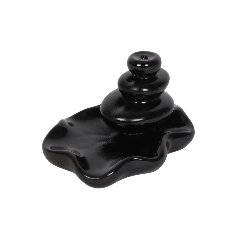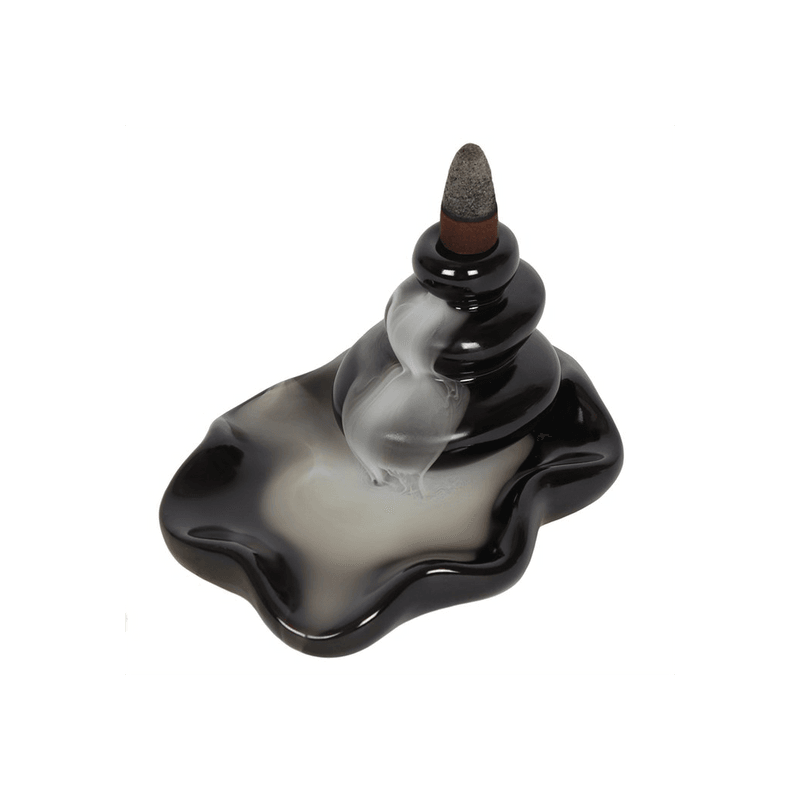 A stunningly simple backflow incense burner in a large black ceramic stacked pebble design. When the cone is lit the smoke from the cone cascades downwards in a mesmerising waterfall effect to pool at the bottom. Beautiful to watch. For best effects burn indoors in an area away from any sudden air movements. Please note that after burning it is normal for a light oily residue to appear on the oil burner, for this reason we recommend protecting any furniture it is placed upon suitably. The residue can be easily wiped off the burner with a damp cloth. Please exercise caution when burning incense. Only backflow incense cones should be used with this product, standard incense cones will not create the desired effect. It is normal for cones to take up to 10 minutes after being lit to start creating the smoking/mist effect. Product Dimensions: H7.5cm x W9.3cm x D12cm Packaged Dimensions: H8.5cm x W13cm x D8.5cm