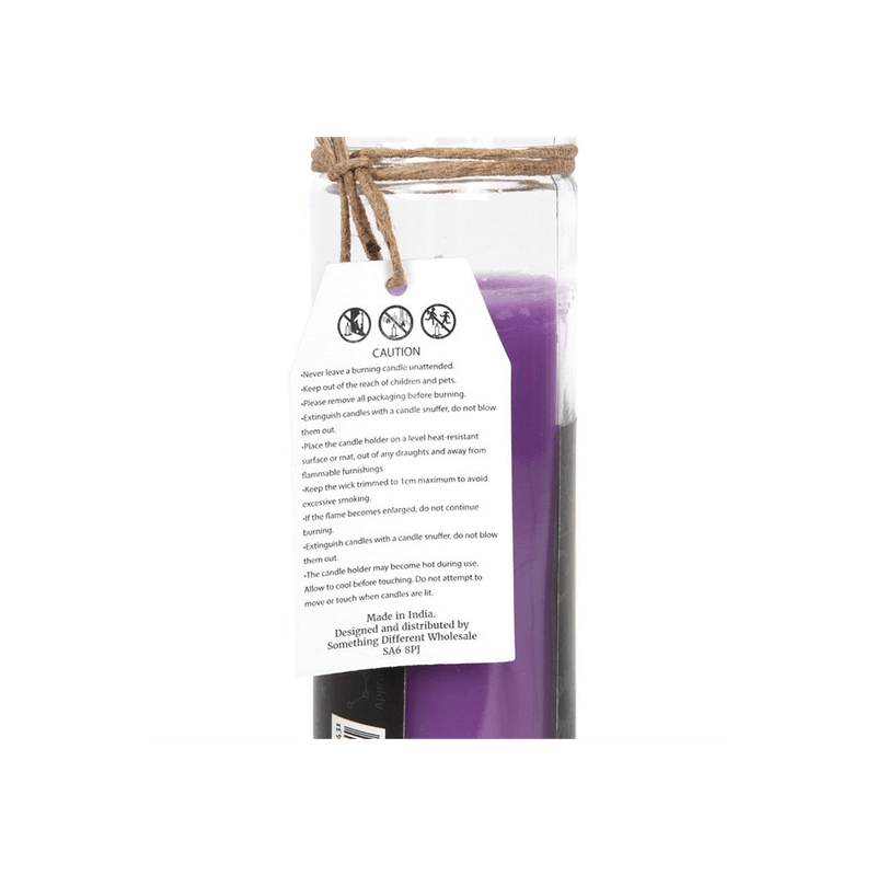 Inspired by traditional 7-day prayer candles, this purple pillar candle is contained in a glass jar and scented with lavender making it perfect for accompanying spells of growth and prosperity. Paraffin wax. Average burn time of 70 hours. Product Dimensions: H21cm x W6cm x D6cm Packaged Dimensions: H22cm x W7cm x D7cm