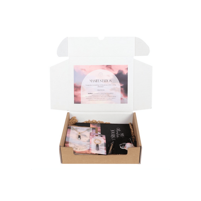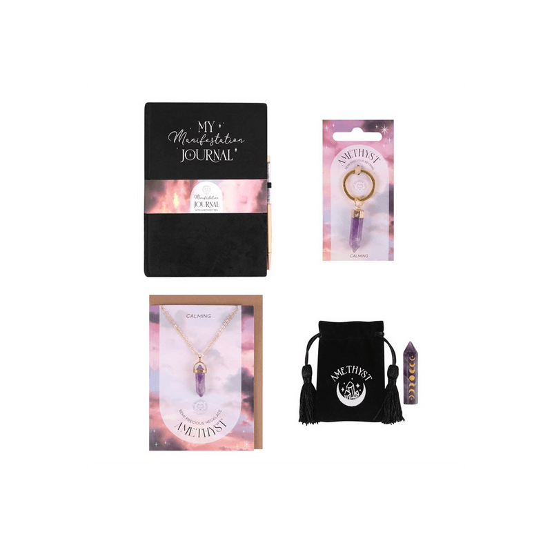 This new Manifestation set comes beautifully presented in a recyclable box with eco-friendly shredded paper filling. Arrives ready to gift for any occasion. Gift set includes one of each of the following products; A5 Manifestation Journal with Amethyst Pen, Amethyst Moon Phase Crystal Point, Amethyst Keyring and Amethyst Necklace. Product Dimensions: H6cm x W25cm x D18.5cm Packaged Dimensions: H6cm x W25cm x D18.5cm