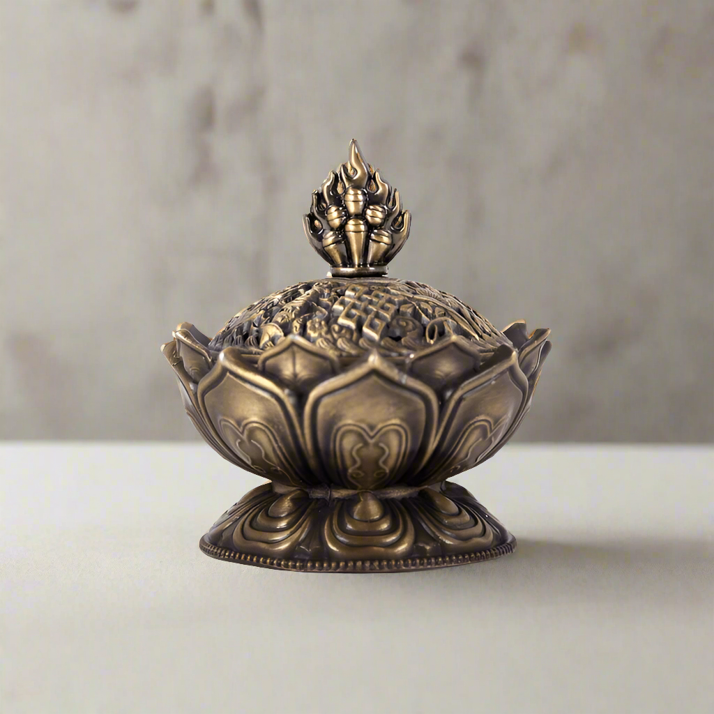 Experience the enchanting allure of burning incense with our Metal Lotus Incense Cone Holder. As the cone burns, watch in awe as the smoke dances through the beautifully crafted lotus flower design.