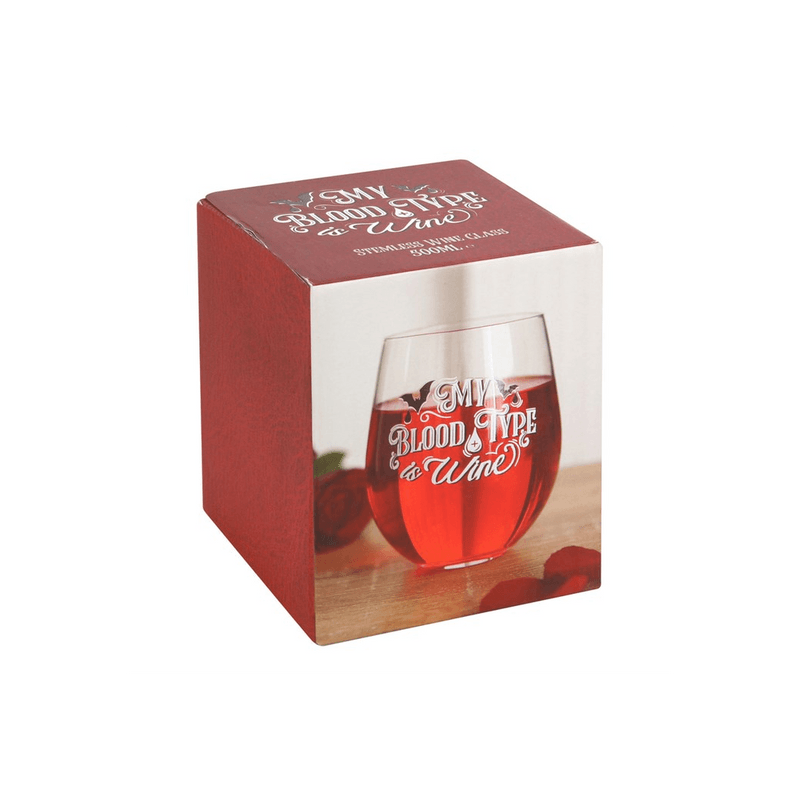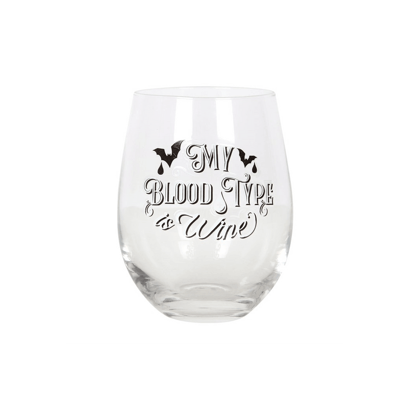 This stemless wine glass features 'My Blood Type is Wine' text with gothic bat designs. Perfect for sipping red wine after a long night of mischief. 500ml capacity. Do not microwave. Hand wash only. Product Dimensions: H12cm x W9.2cm x D9.2cm Packaged Dimensions: H13cm x W10cm x D10cm