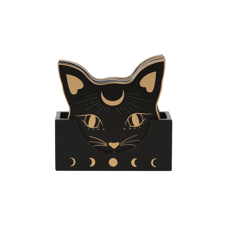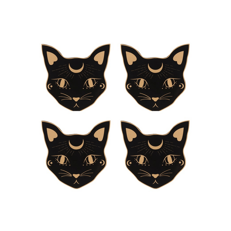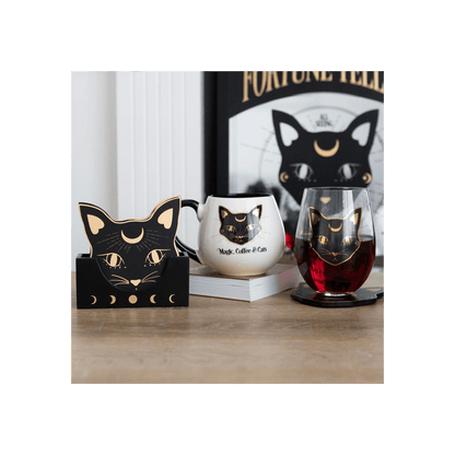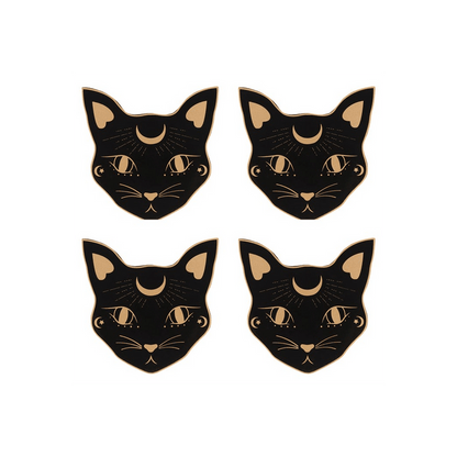 This set of 4 coasters comes in the shape of a mystical cat face and includes a matching holder with crescent moon accents. Product Dimensions: H12cm x W12.5cm x D4cm Packaged Dimensions: H12.7cm x W13.5cm x D5cm