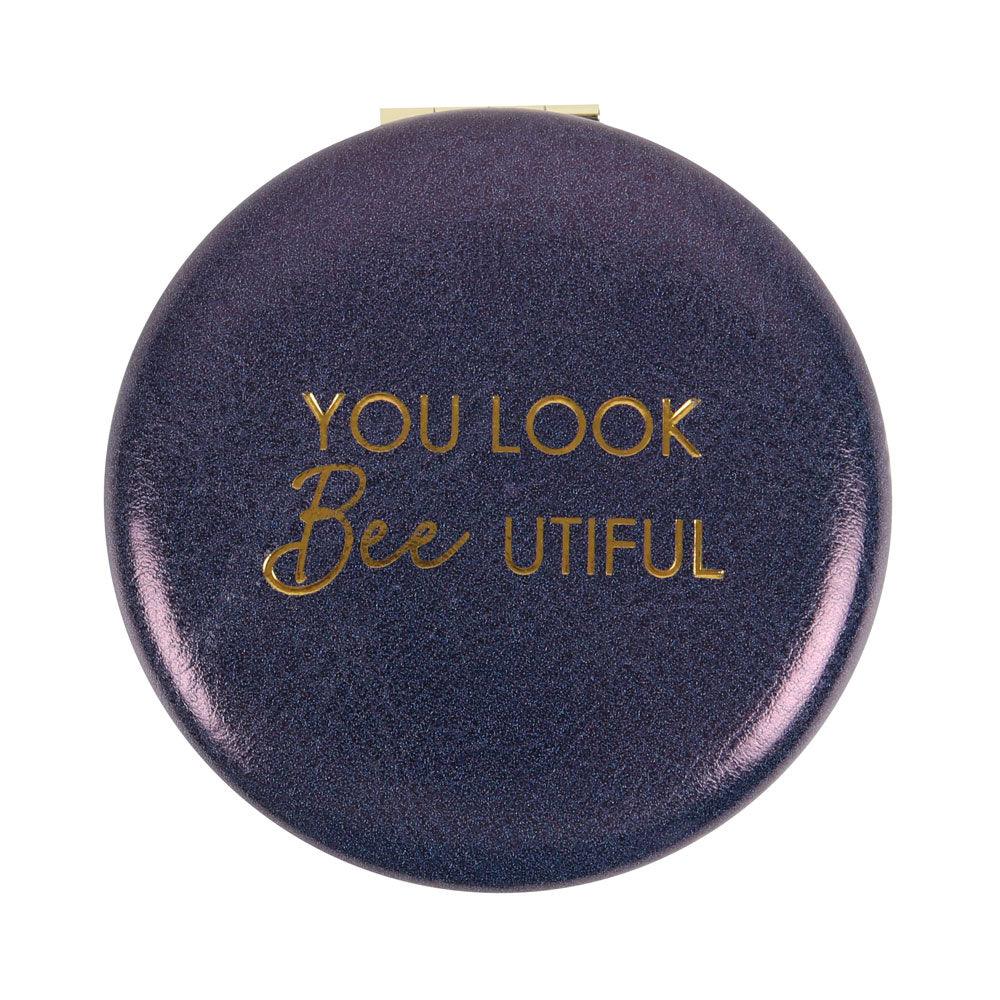 A small compact mirror featuring a gold tone bee accent and perfect for throwing into any handbag.